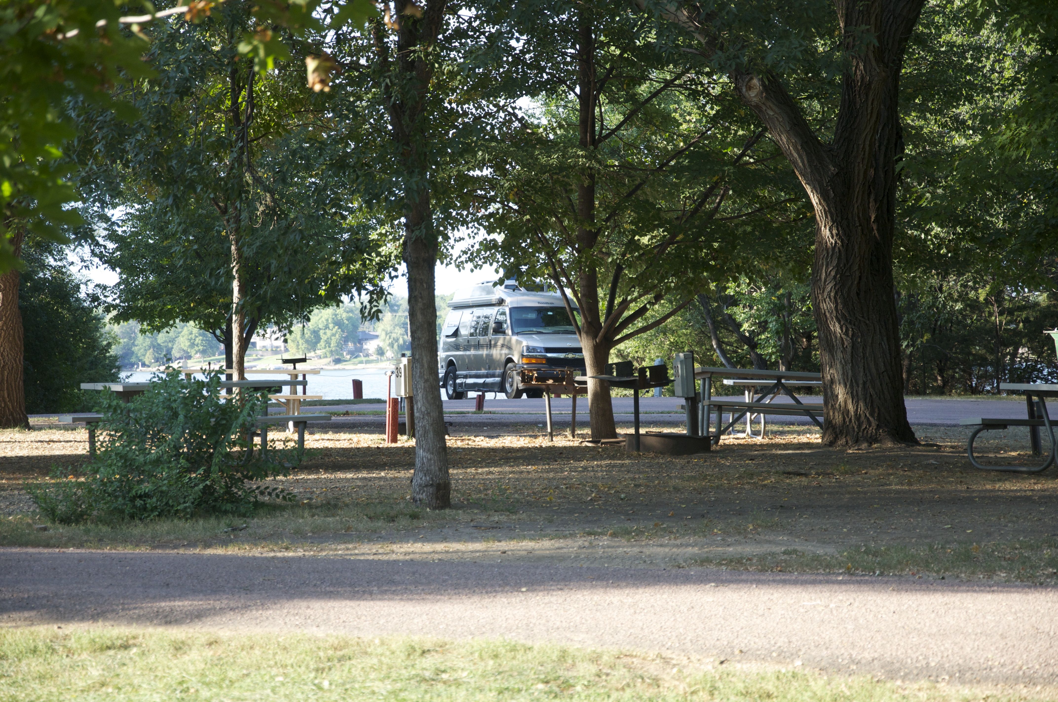 We camped at the Lake Mitchell’s Campgrounds which is run by a nice couple who have the concession from the city which owns the camp. The camp was built by the WPA in the 1930’s. Our site overlooked the large lake and Apollo finally got his swimming in.