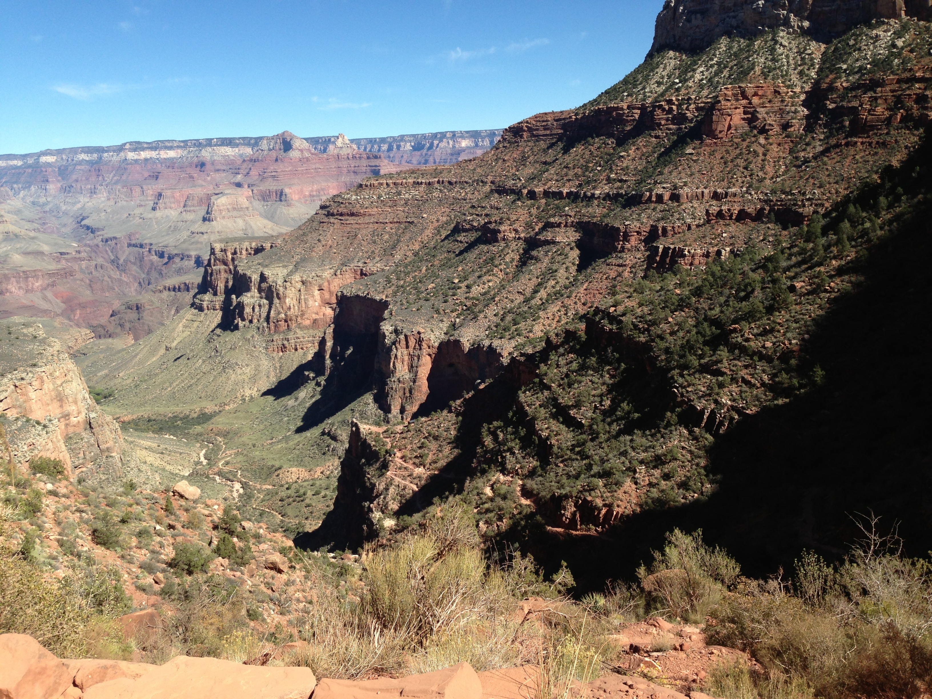 We took a six mile hike on the Bright Angel Trail. We went 3 miles down into the canyon and three miles back up. We only went about a third of the way down and were still six miles short of Colorado River. This was not a particularly tough hike because of the many switch backs, although the climb back gave us a good cardio workout. Joanne was a champ in overcoming her fear of ledges overlooking the abyss. The canyon is quite a sight with the Colorado River running through it. Here are some of the pics from the hike.