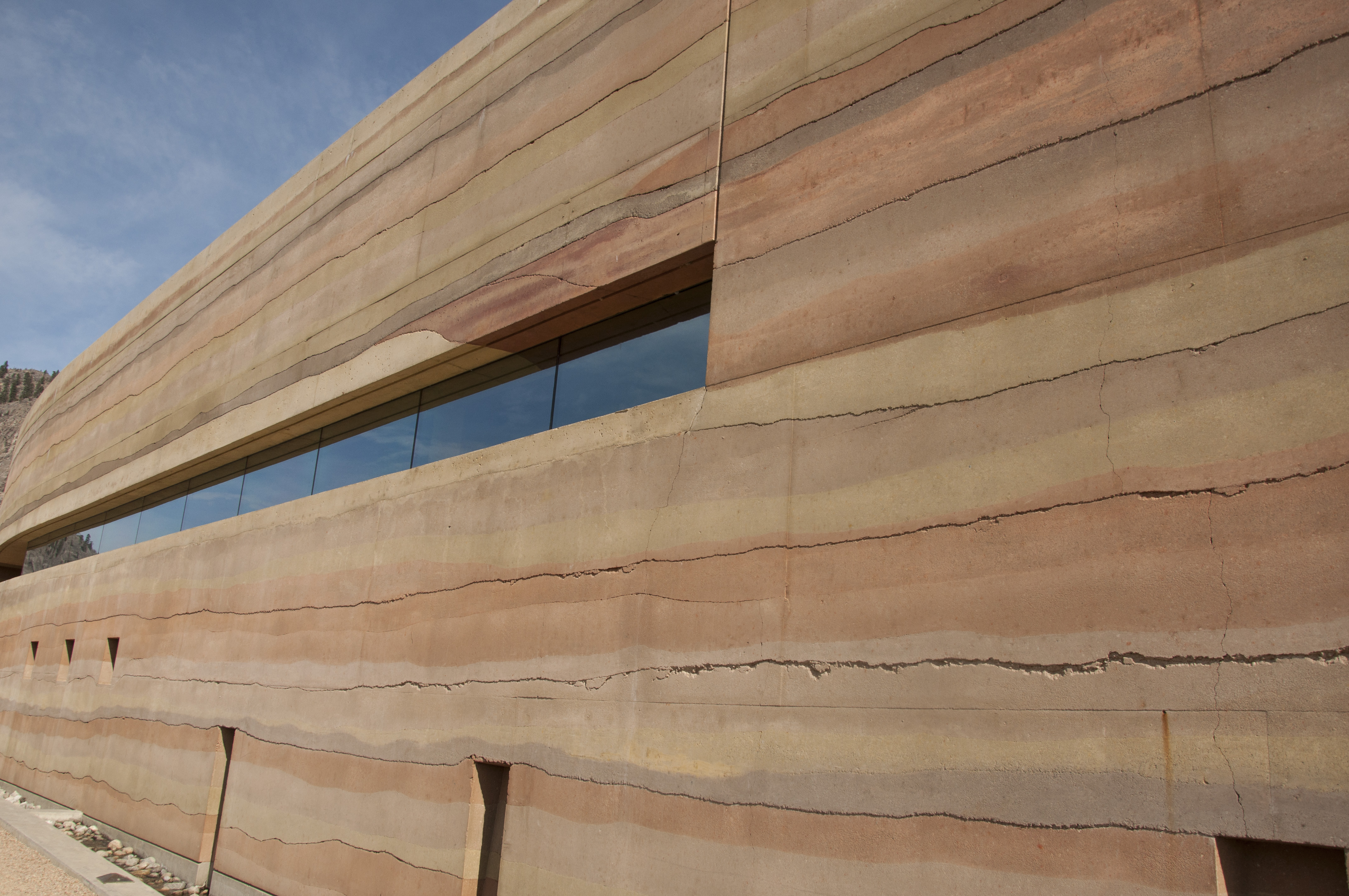 The construction material is traditional packed earth. There is a green roof and the building has geothermal heating.