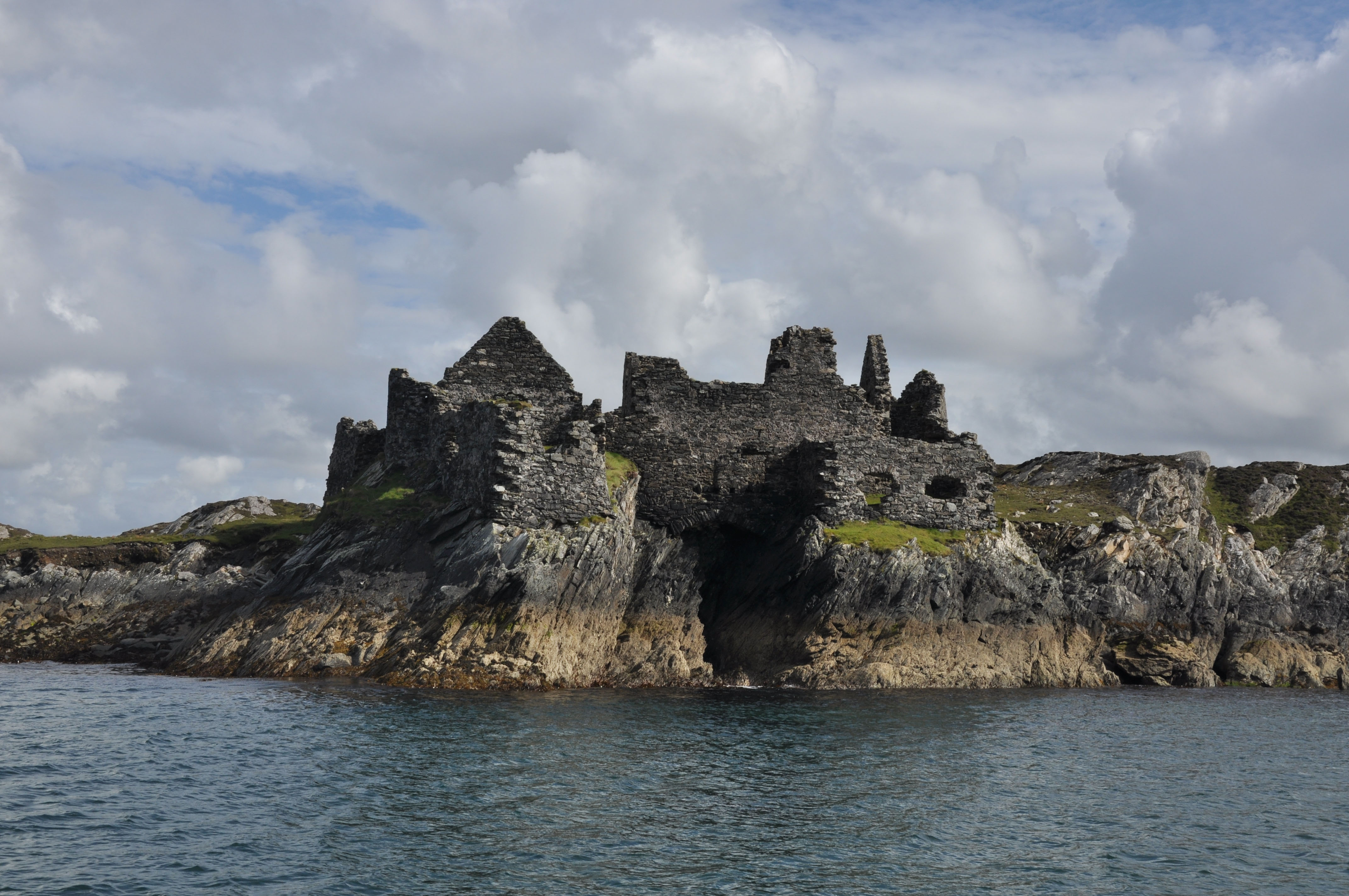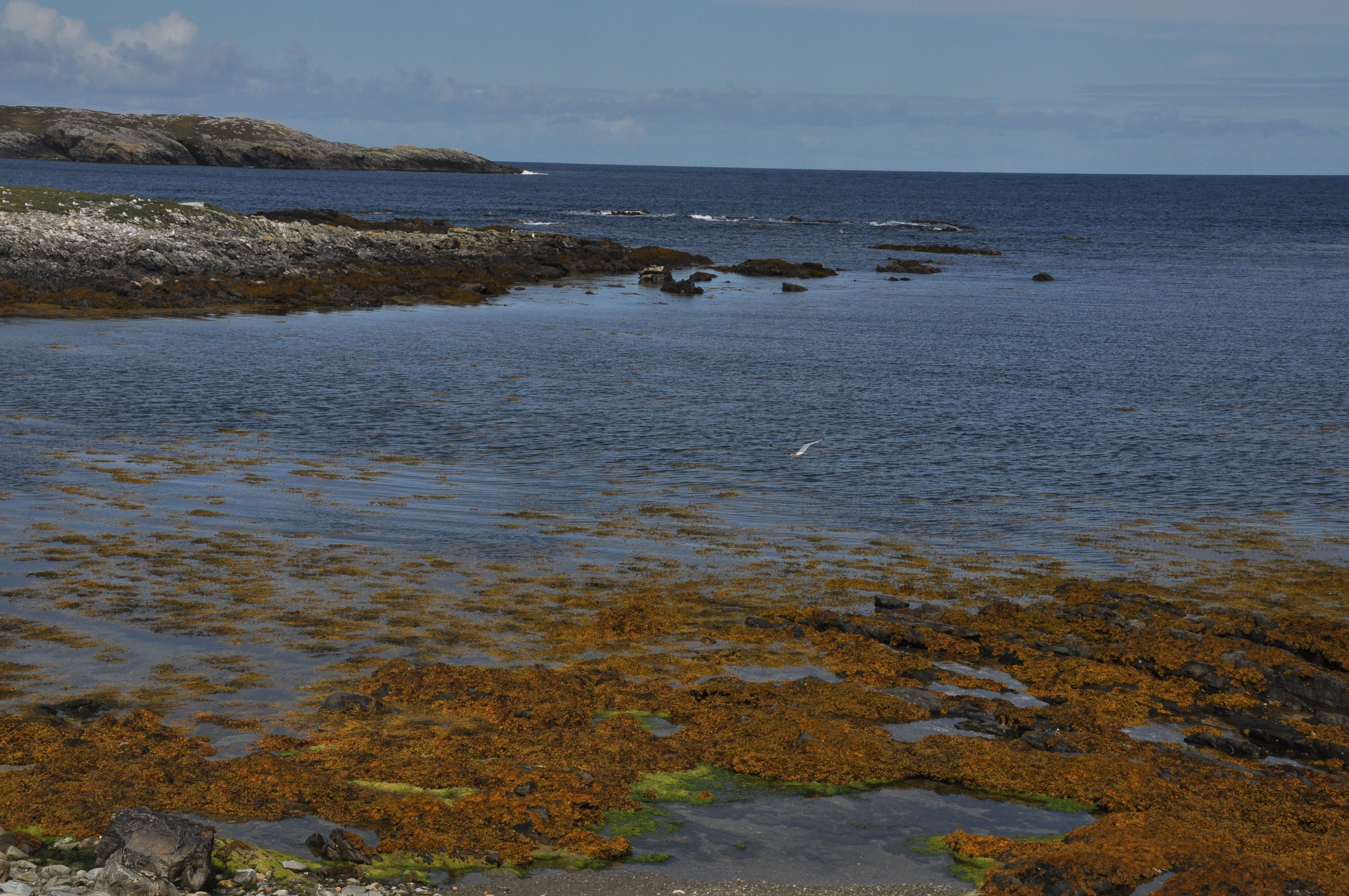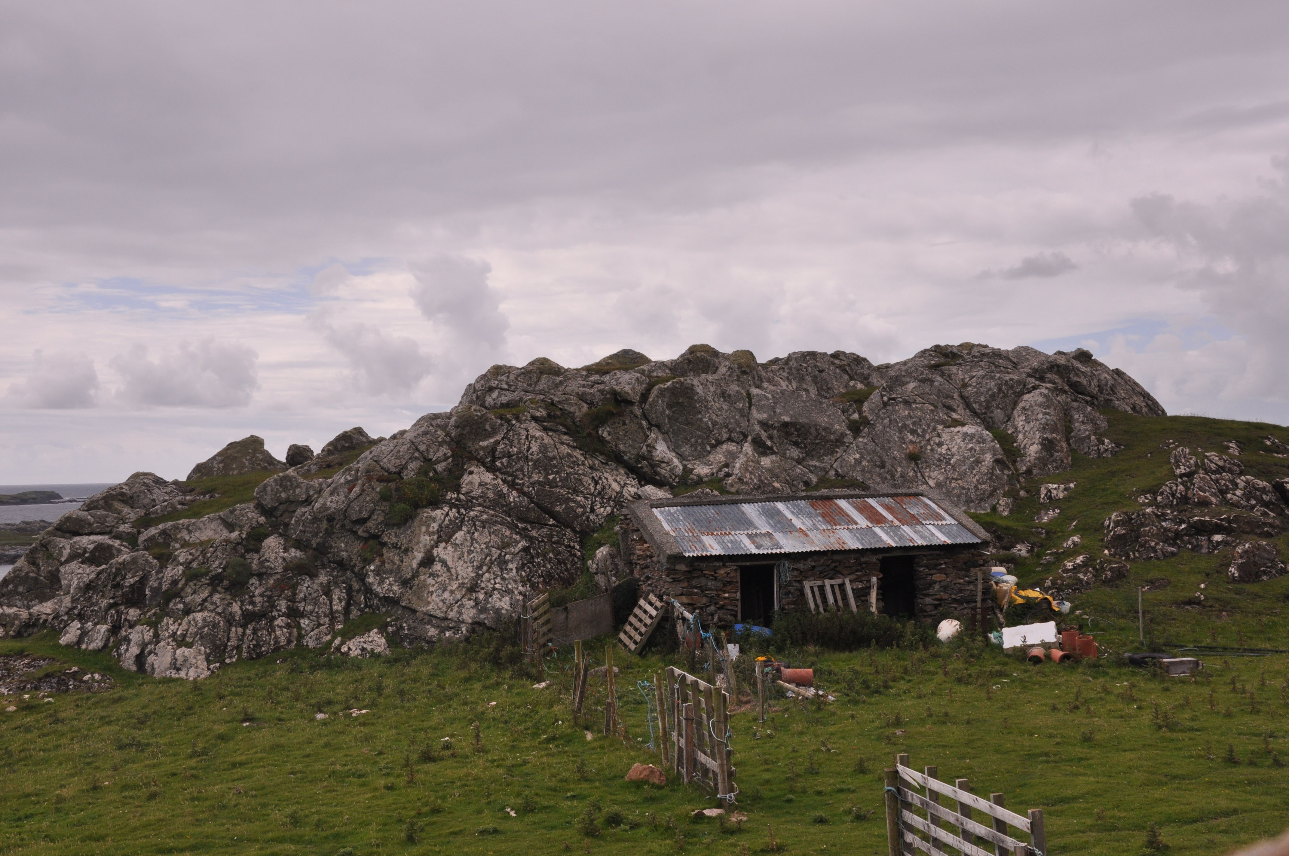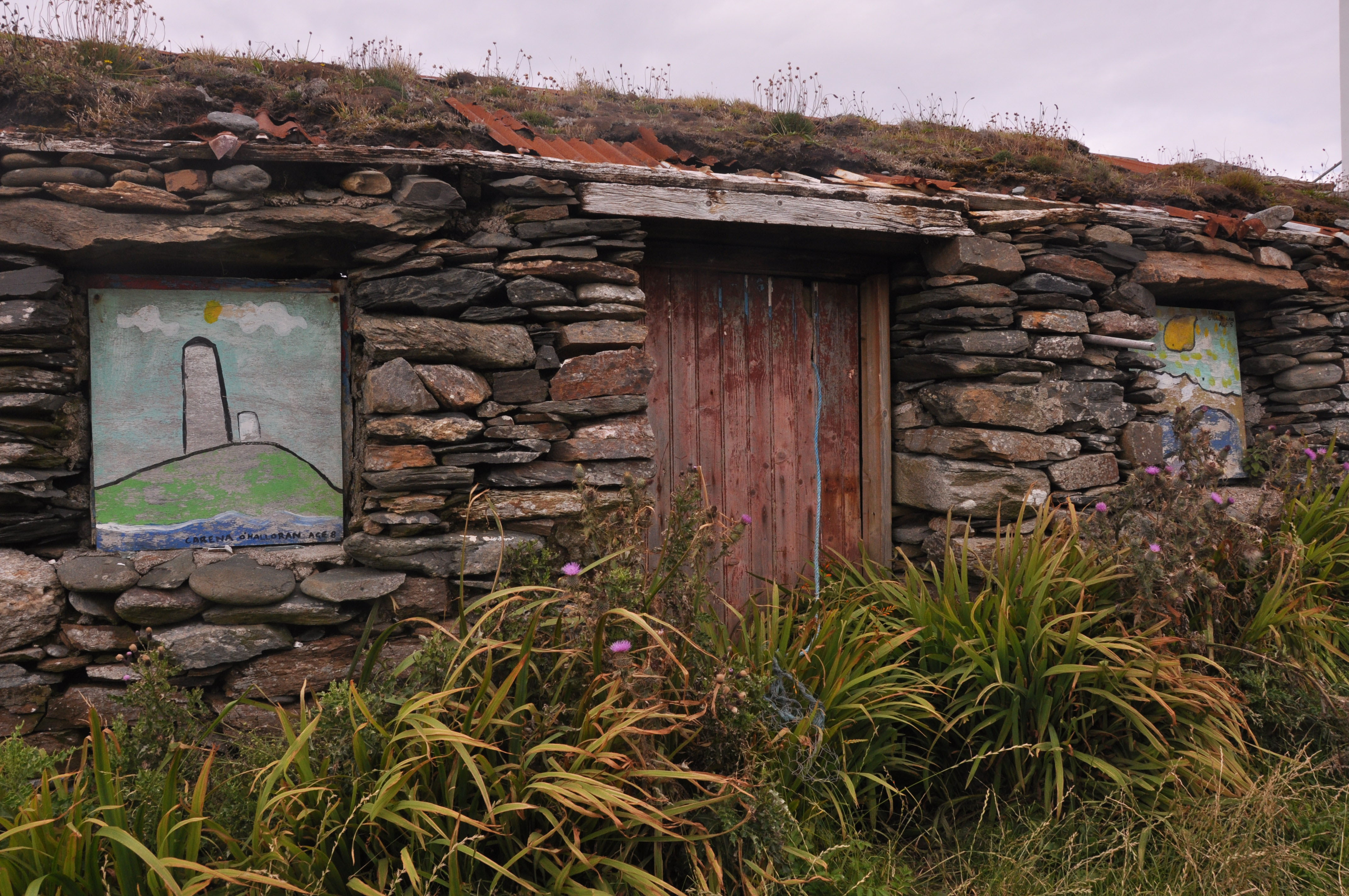 Inishbofin is a small island off the western Connemara coast reached by ferry from Cleggan which is 7 kilometers north of Clifden. We arrived early in the morning and while we waited on the dock for the ferry we learned about “The Cleggan Disaster”. In October of 1927, an enormous storm hit without warning. In one hour forty-five men in small open boats were drowned in Cleggan Bay. There is a memorial near the Cleggan dock and a mural painted by school children on Inishbofin depicting the disaster. The Bay was very calm during our brief voyage and the sun was shining. As we sailed into the harbor we noticed what appeared to be the remnants of a castle. This skeleton of a structure, we later learned, is Cromwell’s 16th Century Barracks. It was used as a prison for catholic priests from all over the country after the English Statute of 1585 declared them guilty of high treason. Inishbofin was also hard hit by the Irish Famine in the mid 19th Century. The small but very interesting Heritage Museum on the Island informed us that in 1841 the population was 1404. Today it is less than 200. Now the economy is heavily dependent on tourism which is on the light, laid back side. Fishing and agriculture follow. Our impression was of a place untouched and unspoiled by modern civilization. We tramped the countryside following rudimentary roads and paths and at times climbing over stone fences. We watched kids splash around in the cold waters and observed families enjoying their summer.
