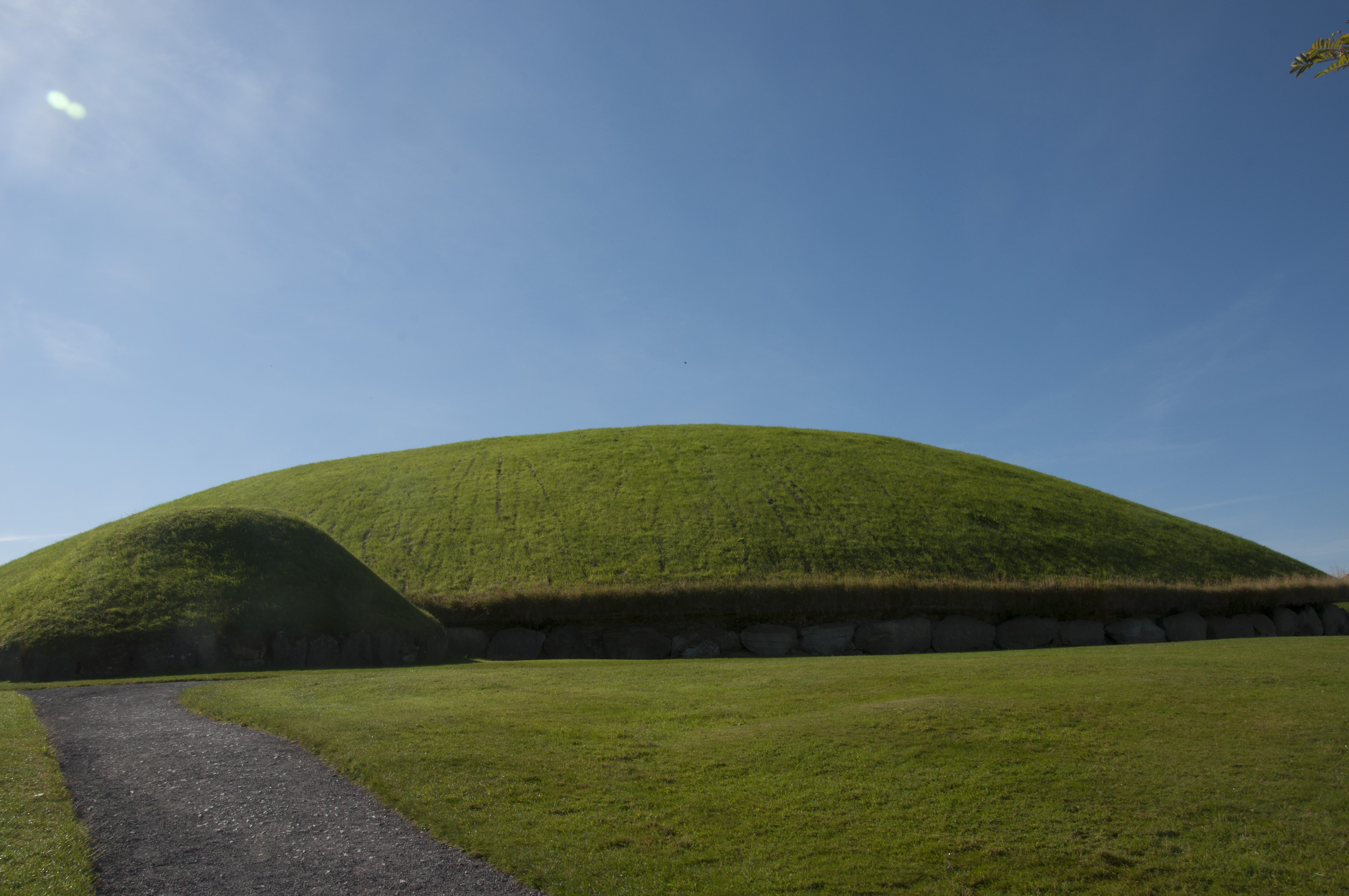 The Knowth mound with engraved kerbstones is in the foreground. A satellite tomb is shown in the distance. The Mound is surrounded at its bottom with 127 kerbstones with engraved decorations. There are also free standing stones at the outside of the tomb entrances which also have examples of Neolithic art. Two large tombs were discovered within this large central mound and 18 satellite tombs were discovered in the surrounding area. These large stones were hauled from a great distance. It is thought that tree trunks were laid to create tracks upon which the boulders could be rolled.