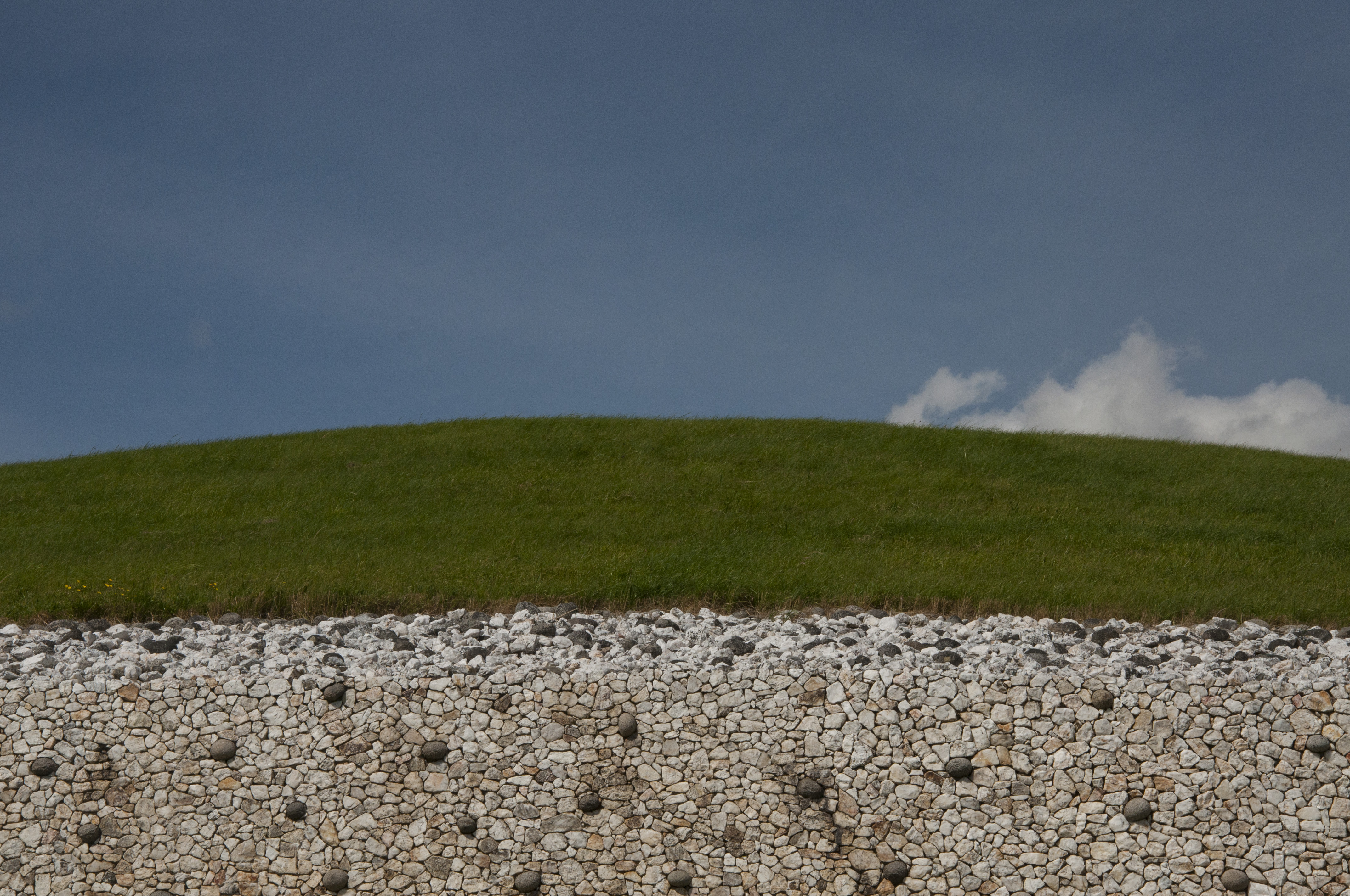 As we approached Knowth with its perfect symmetry against the (sigh) blue sky, we felt we were in an unusual place. Knowth is orientated so that its two passages face east and west, suggesting a possible equinoxial alignment. The mound is also placed in relation to Newgrange so that the two align with one of the moon’s minor standstill’s.
