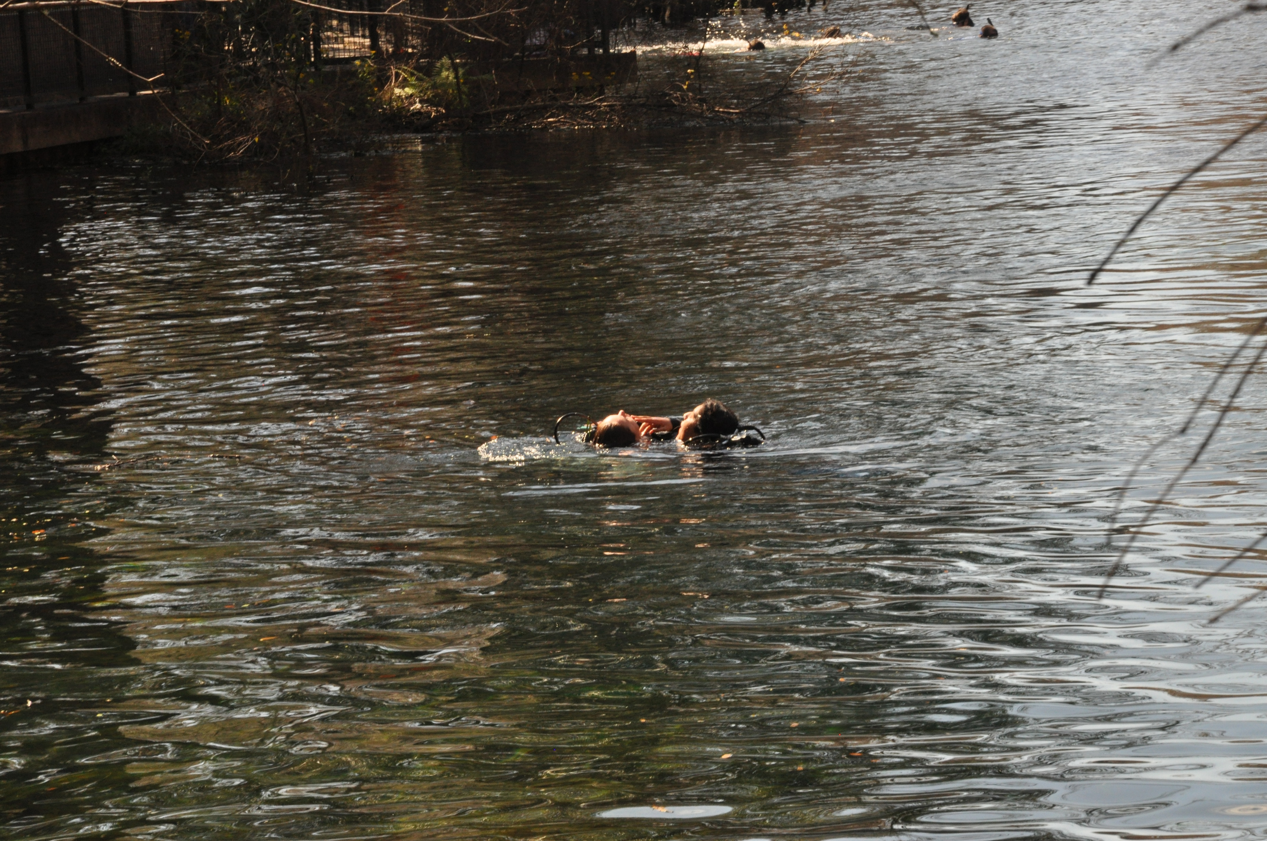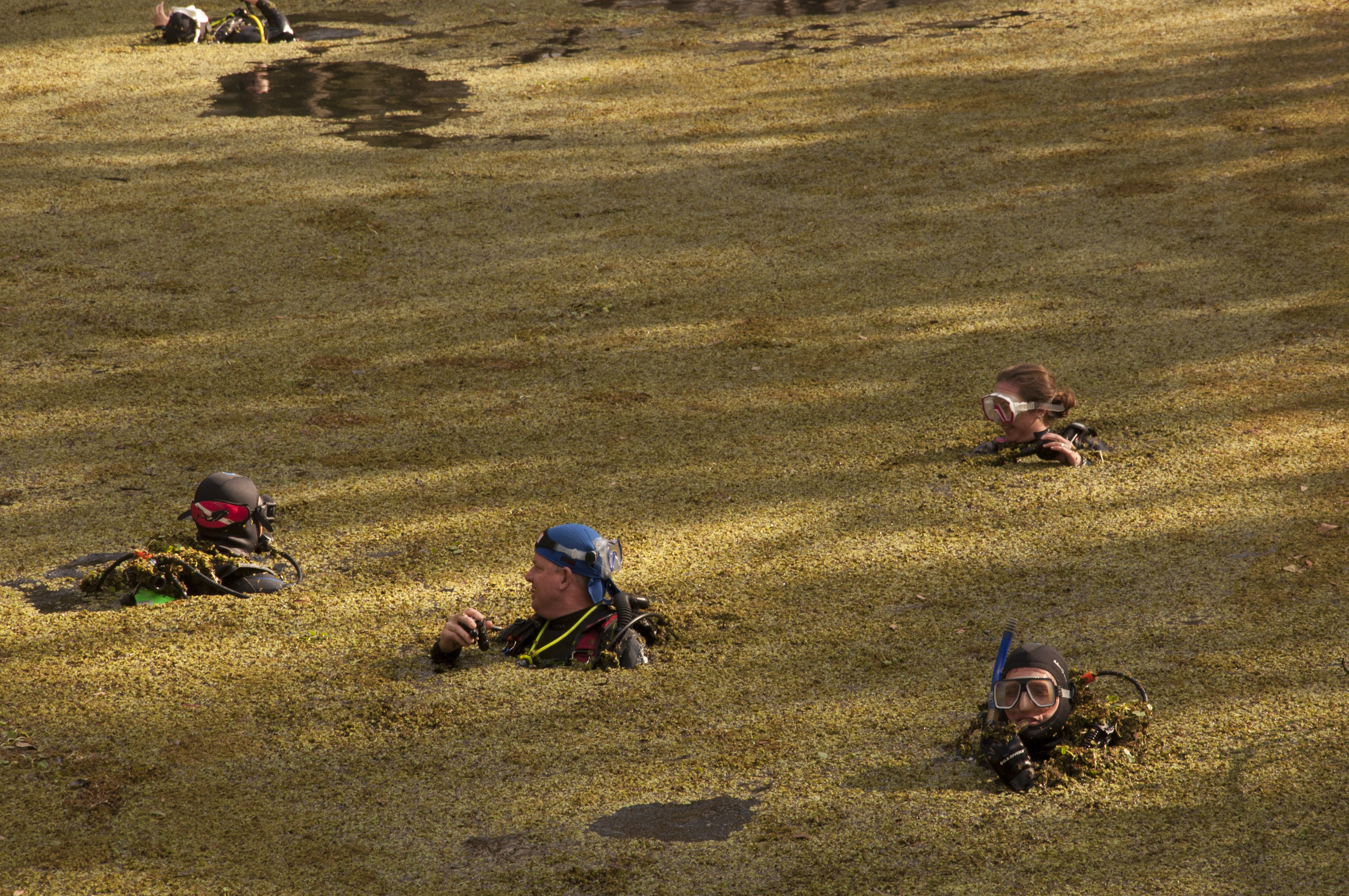 Scuba divers here are getting ready to explore the depths of “The Catfish Hotel”, a sinkhole named for the abundant catfish that divers often find 90 feet below the surface of the water. But, first they have to get through the duckweed. The sinkhole carries water to Manatee Spring.