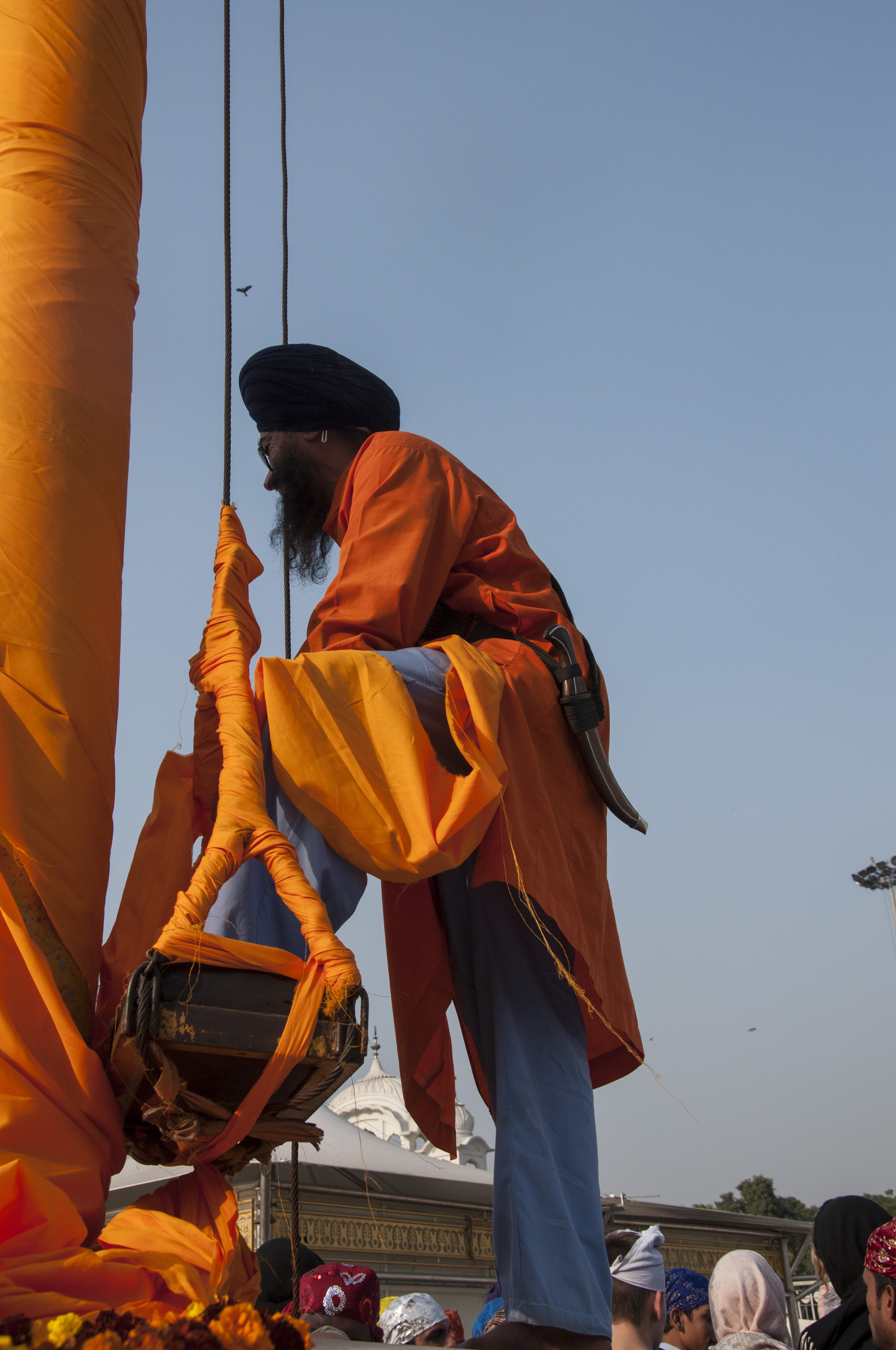 The purpose of the mast, which features an orange cloth wrapping along its entire length and illuminated fibreglass “Khanda” (a double-edged sword) at the top, is to reflect the fundamental concepts of Sikh religion. The colour of the wrap and the “Khanda” ensures that the pole and hence the temple is visible from afar. The mast is lowered annually for the Sikh New Year Ceremony which involves taking off the old cloth, washing the pole with pure milk, cleaning it with water and wrapping it again with a new cloth. Here we see the wrapping process.