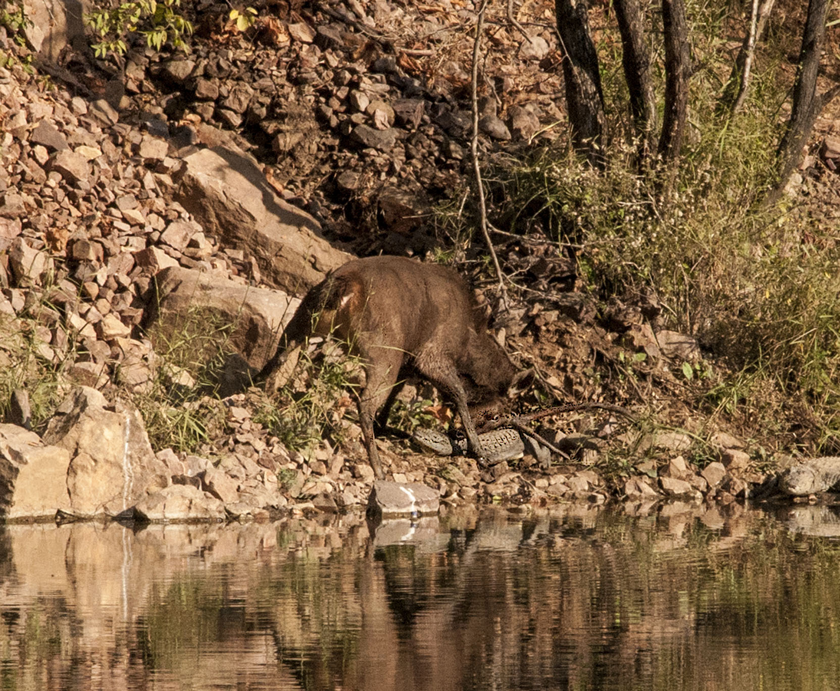 He beat up and killed it, then kicked the croc carcass into the water. But he better be looking over his shoulder for the Tiger.