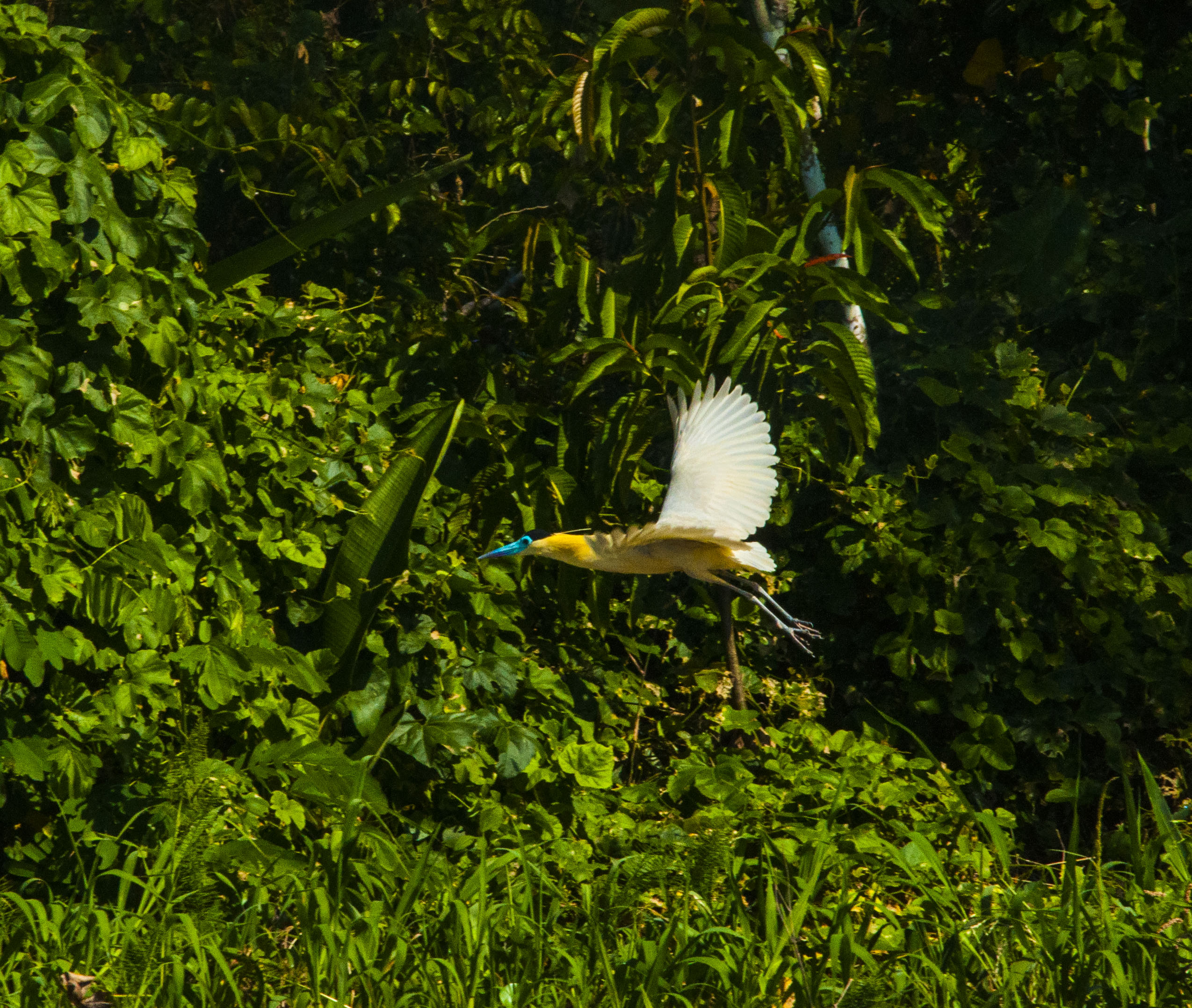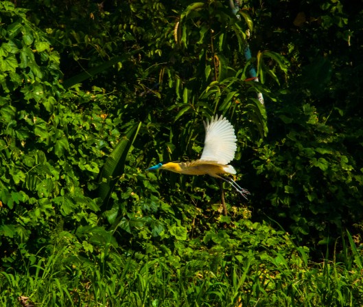Now that’s a strange looking bird with a blue face and a single feather coming off the back of its head! It’s a Capped Heron in flight. Wow!