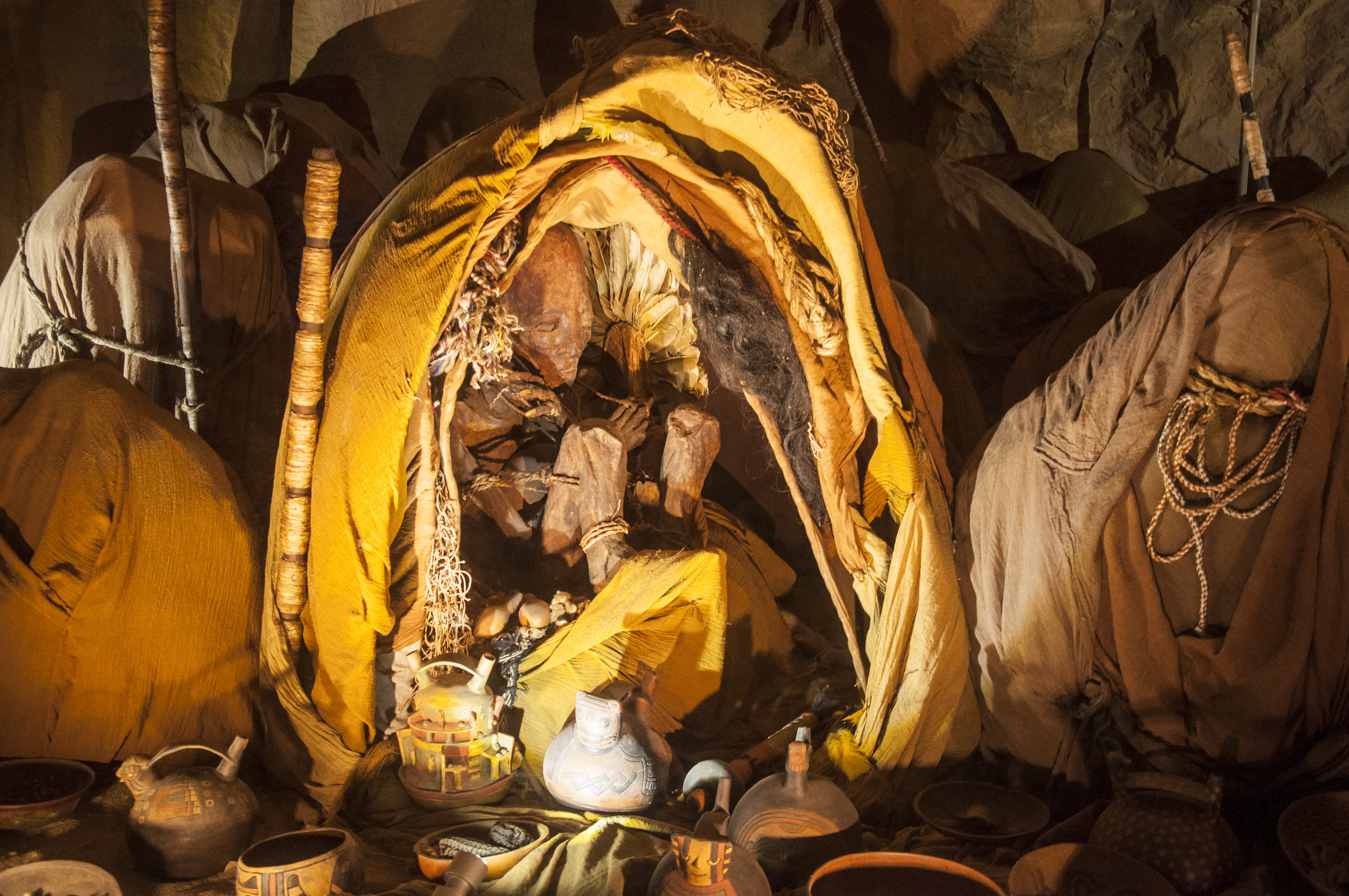 A Ware mummy, buried in fetal position, with vessels to be used in the afterlife (at the National Museum of Peru).