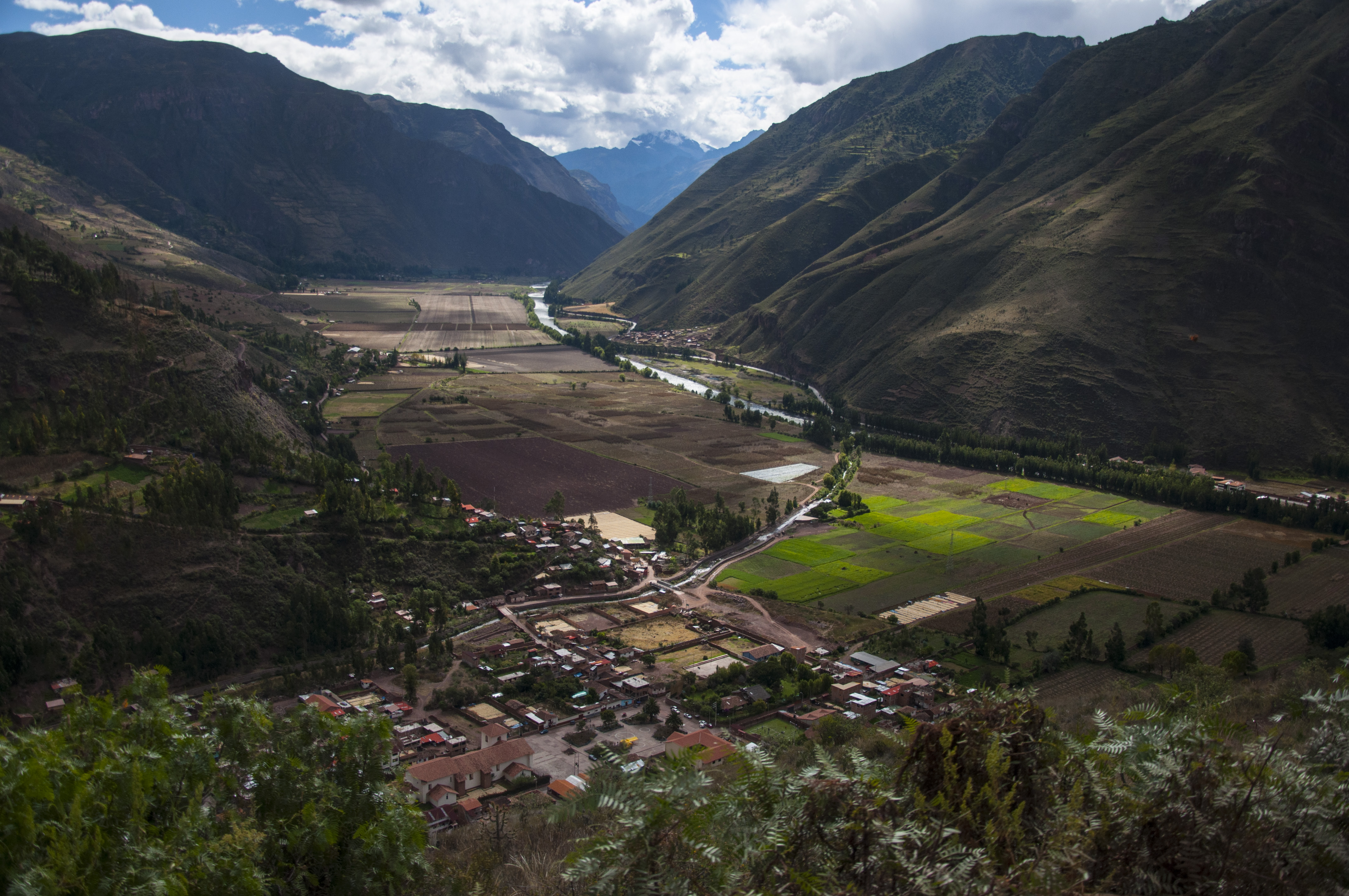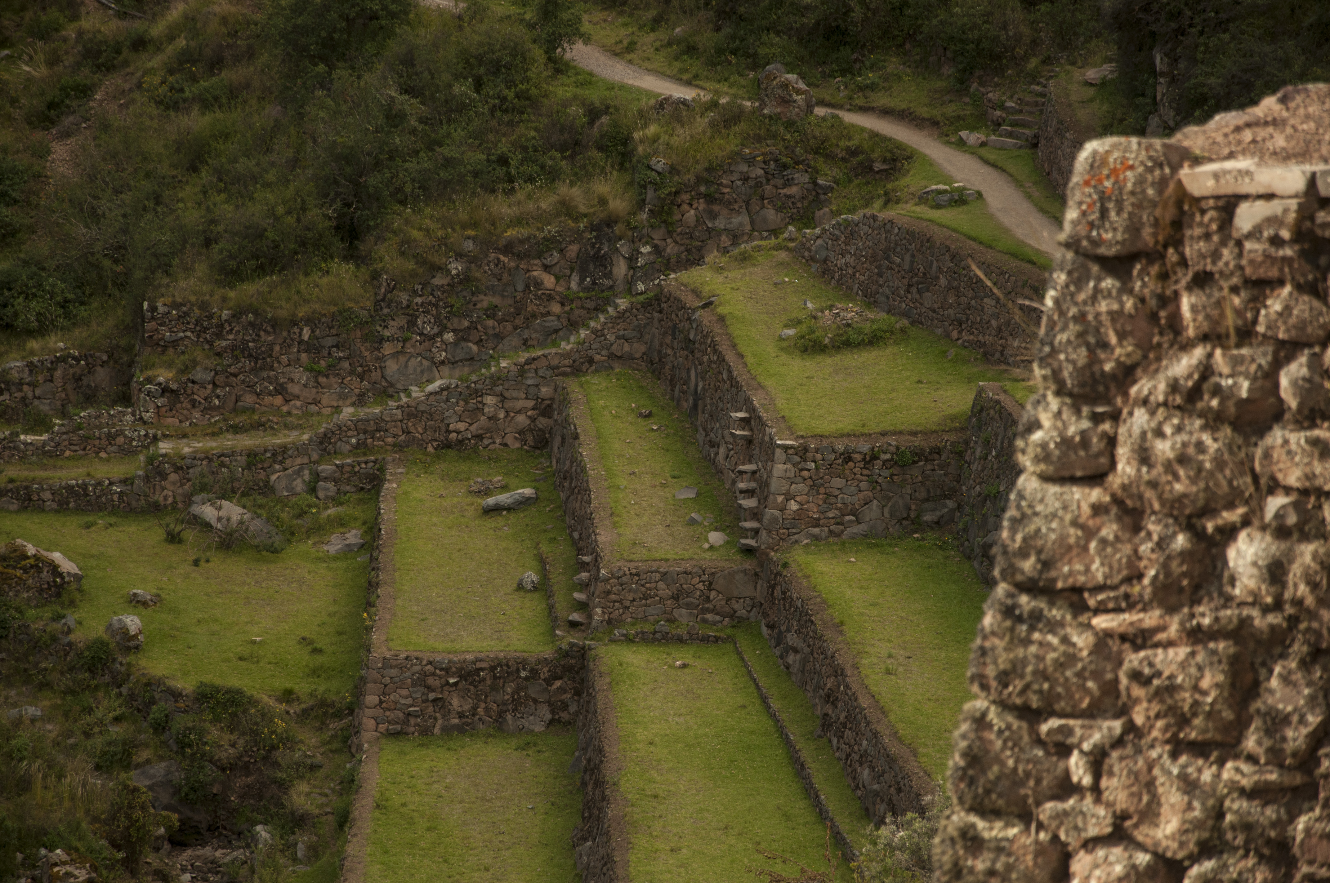 View of the agricultural terraces. In the Inca Empire, society was tightly organized. Land was divided in roughly equal shares for the emperor, the state religion, and the farmers themselves.