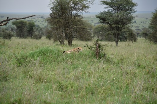 When we were about 1/4 mi. from our camp Goodluck cried out “cheetah!” and our caravan came to a halt. There it was, hidden in the grass, the fastest land animal in the world. Can you find it? The cheetah is hard to see because its spotted coat blends with the tall, dry grass of the plains.