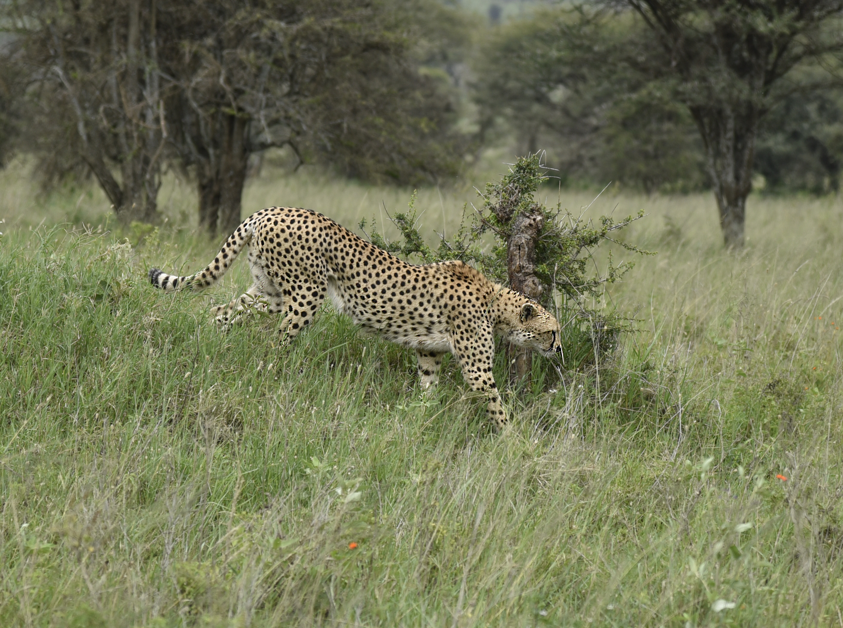 Its hiding place discovered, our cheetah slowly got up, its magnificent markings becoming visible. Cheetahs are diurnal (meaning that they are active during the day) and can reach speeds of 68-75 mph. Males are social and are usually found in groups of 3 or 4. Adult females without cubs are solitary.