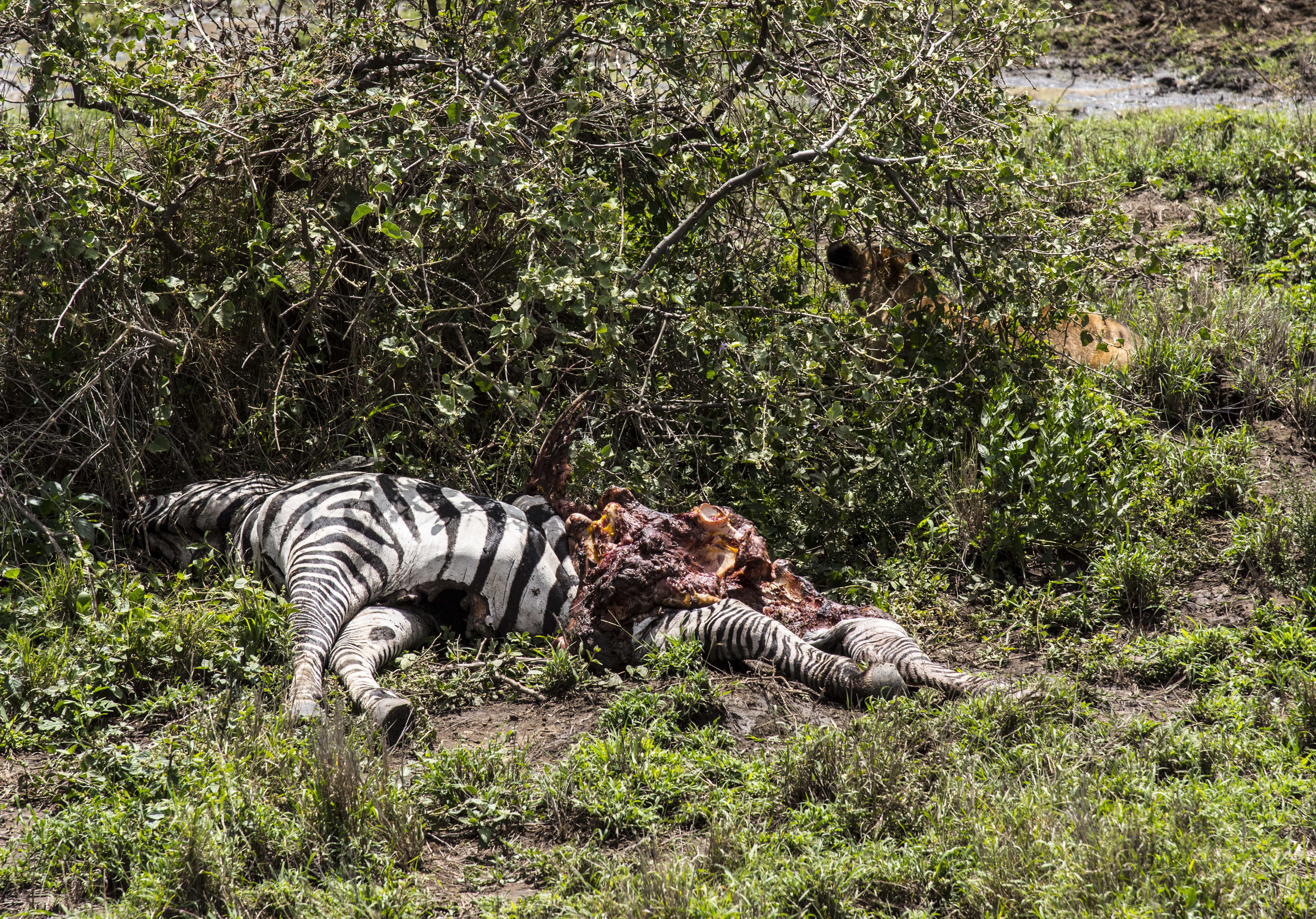 Hidden under a bush was their food source, a half eaten zebra. One of the cubs can be seen nearby.