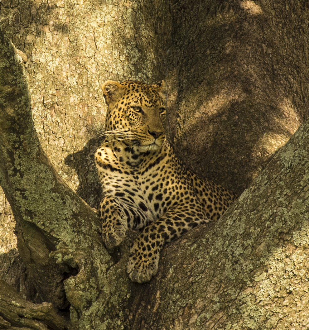 The leopard is elusive and often difficult to find. Unlike the cheetahs and lions, they are nocturnal and rarely hunt during daylight. We were very fortunate to discover this leopard lounging in a tree. They are the smallest of the big cats but extremely powerful and able to drag their kill up onto a tree branch. It is not uncommon to find the carcass of a large animal such as a zebra or giraffe hanging from a branch of a tree, the work of a leopard. This leopard seemed unperturbed by the attention it was receiving.