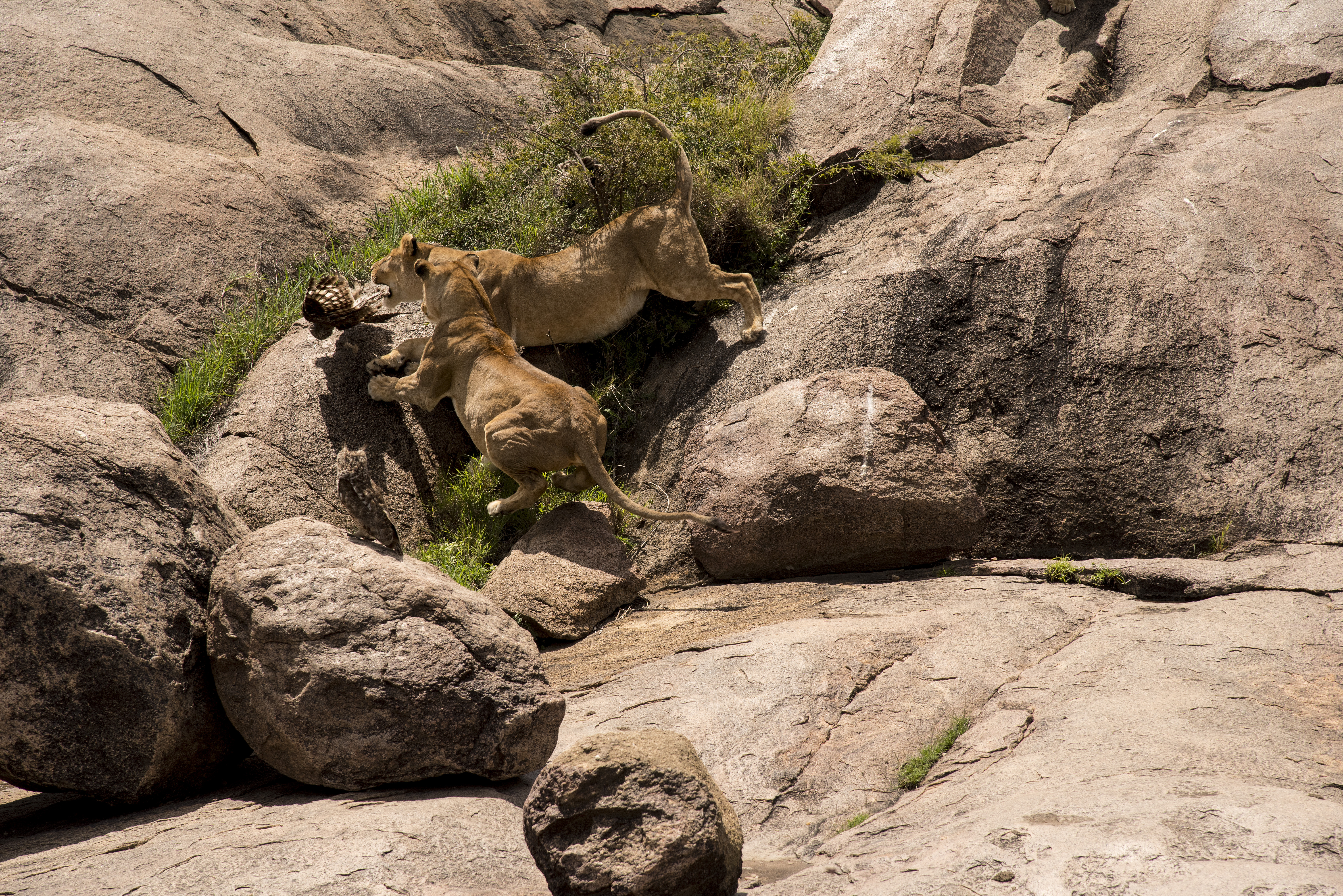 Suddenly the two lionesses made a surprise move and leapt upon three owls that were sitting in a nearby bush. Two of the owls escaped with the loss of just a few feathers. The other owl remained still and undisturbed during the Brouha.