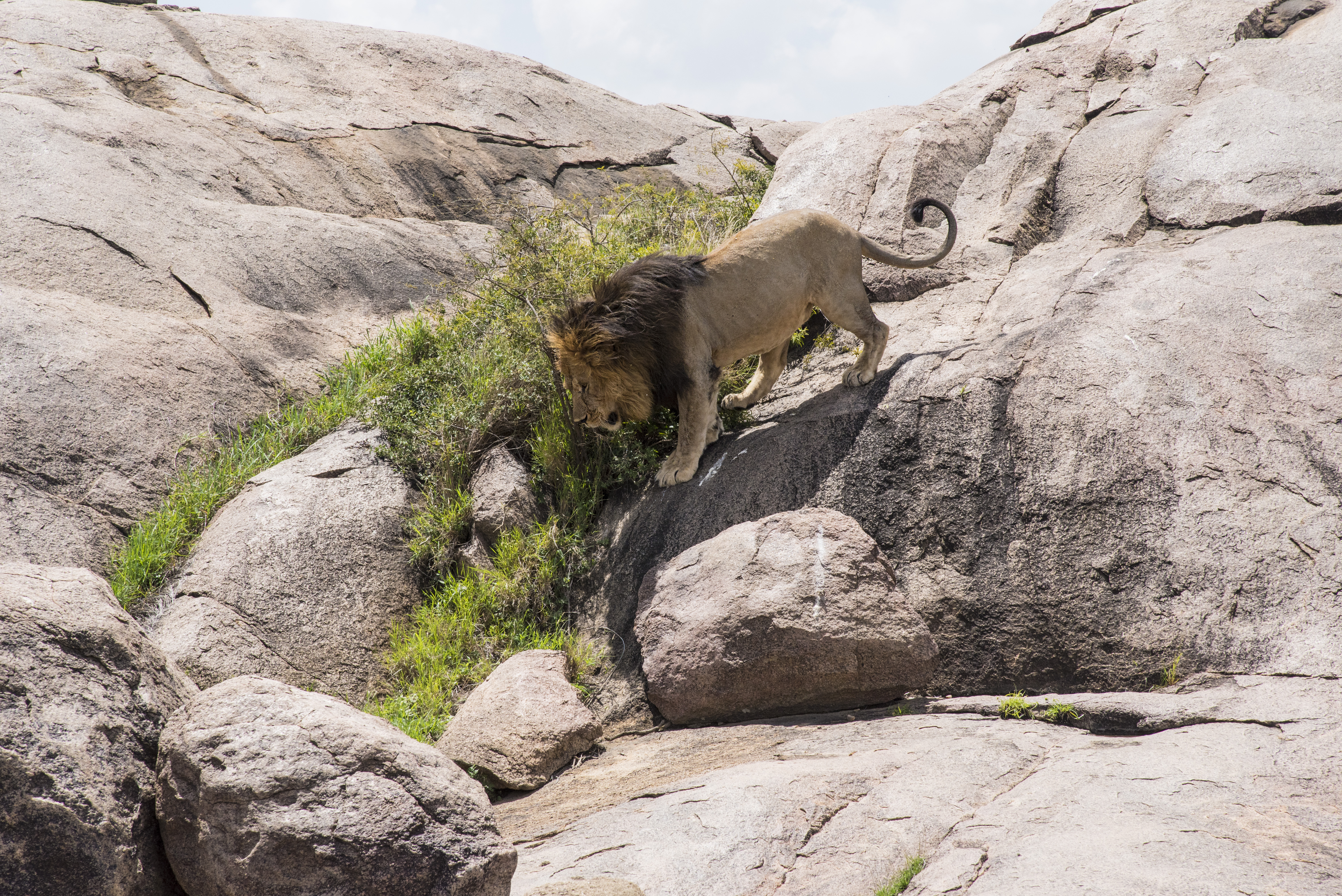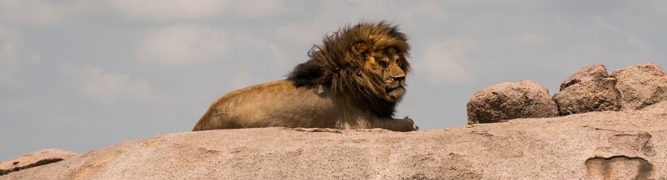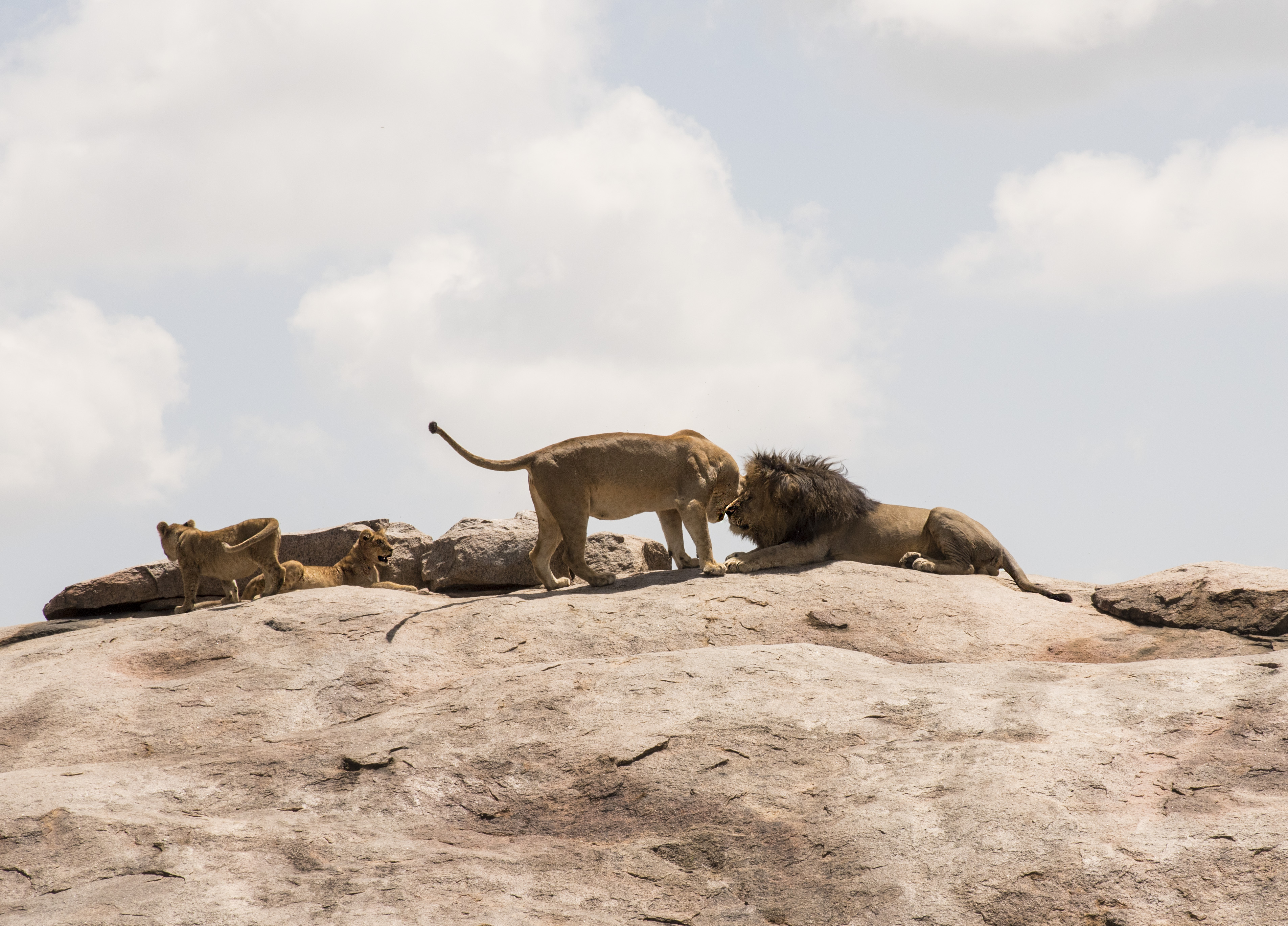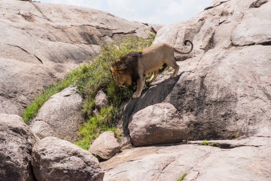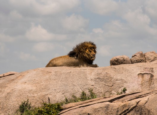 Because we started out early our three vehicles were the only ones around when this mature male lion with a huge mane was found relaxing atop a Serengeti kopje. Kopjes are isolated rock groupings that big cat favorites for shelter, and for surveying the landscape for hunting opportunities. It soon became apparent that we had come upon an entire pride.