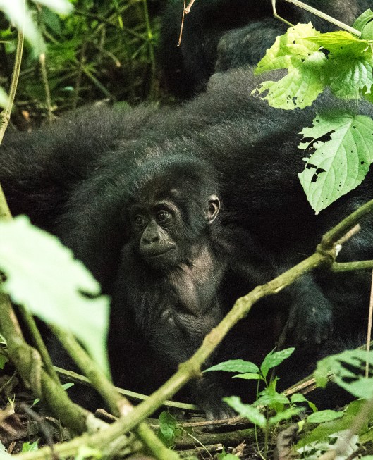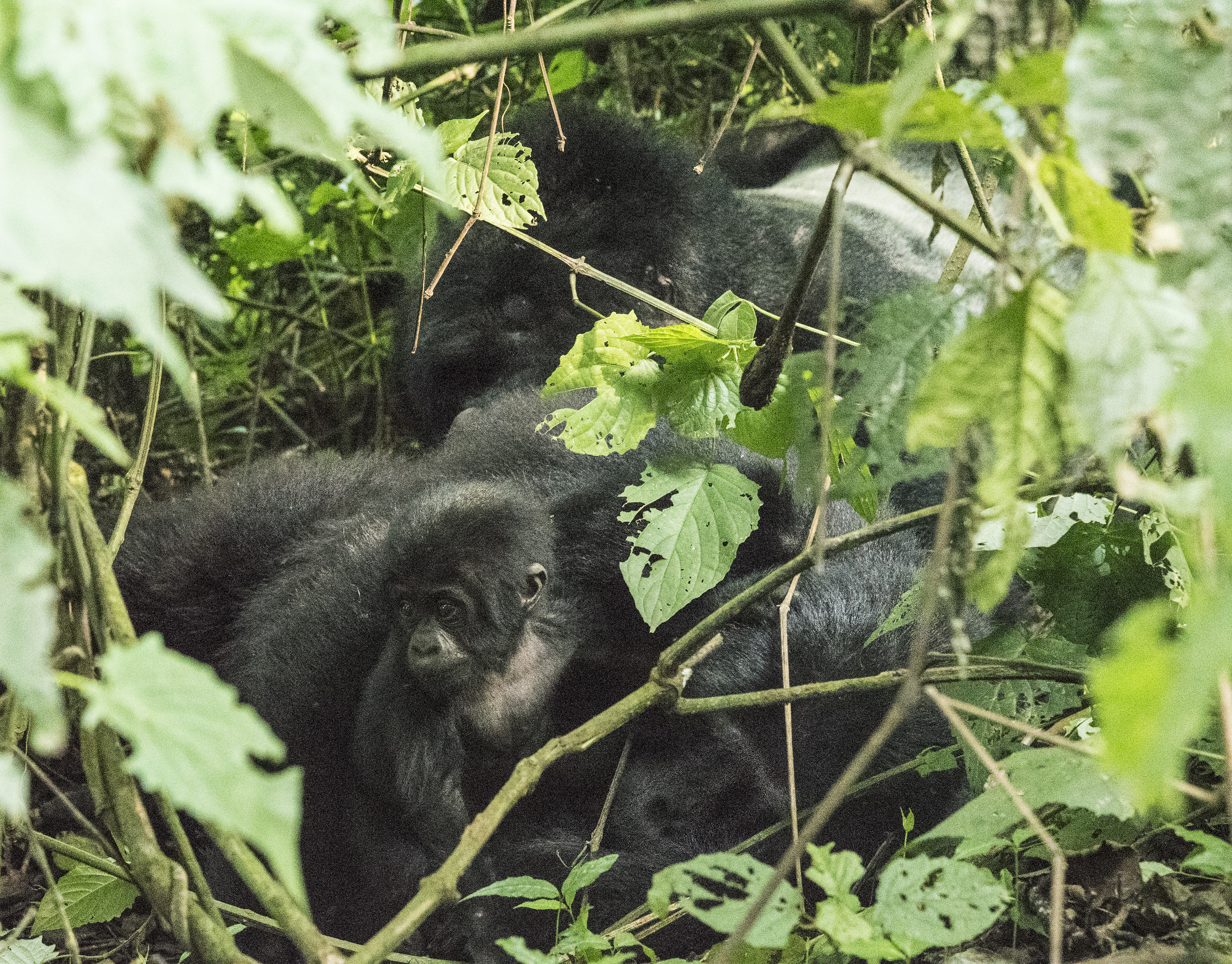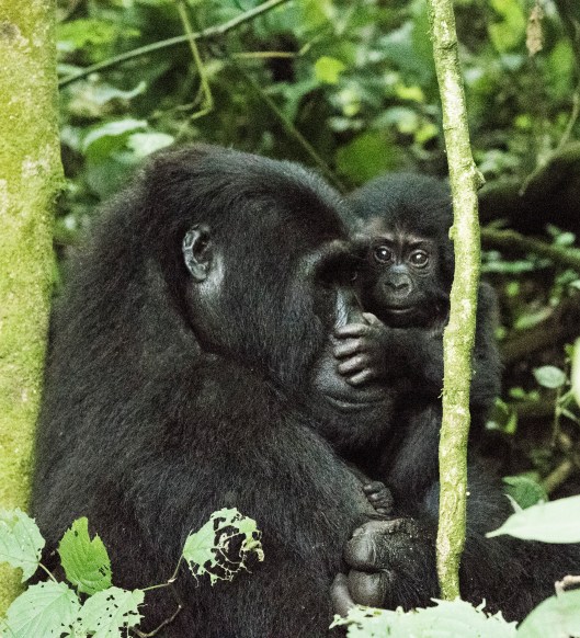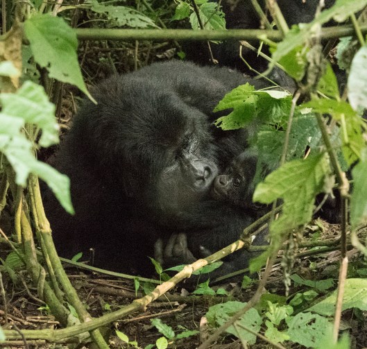 “There’s a newborn baby” the ranger told us as he pointed to nest where the silverback had gone after coming down from the tree. We found Rukara grooming the new mother who was resting with her arm around the baby.