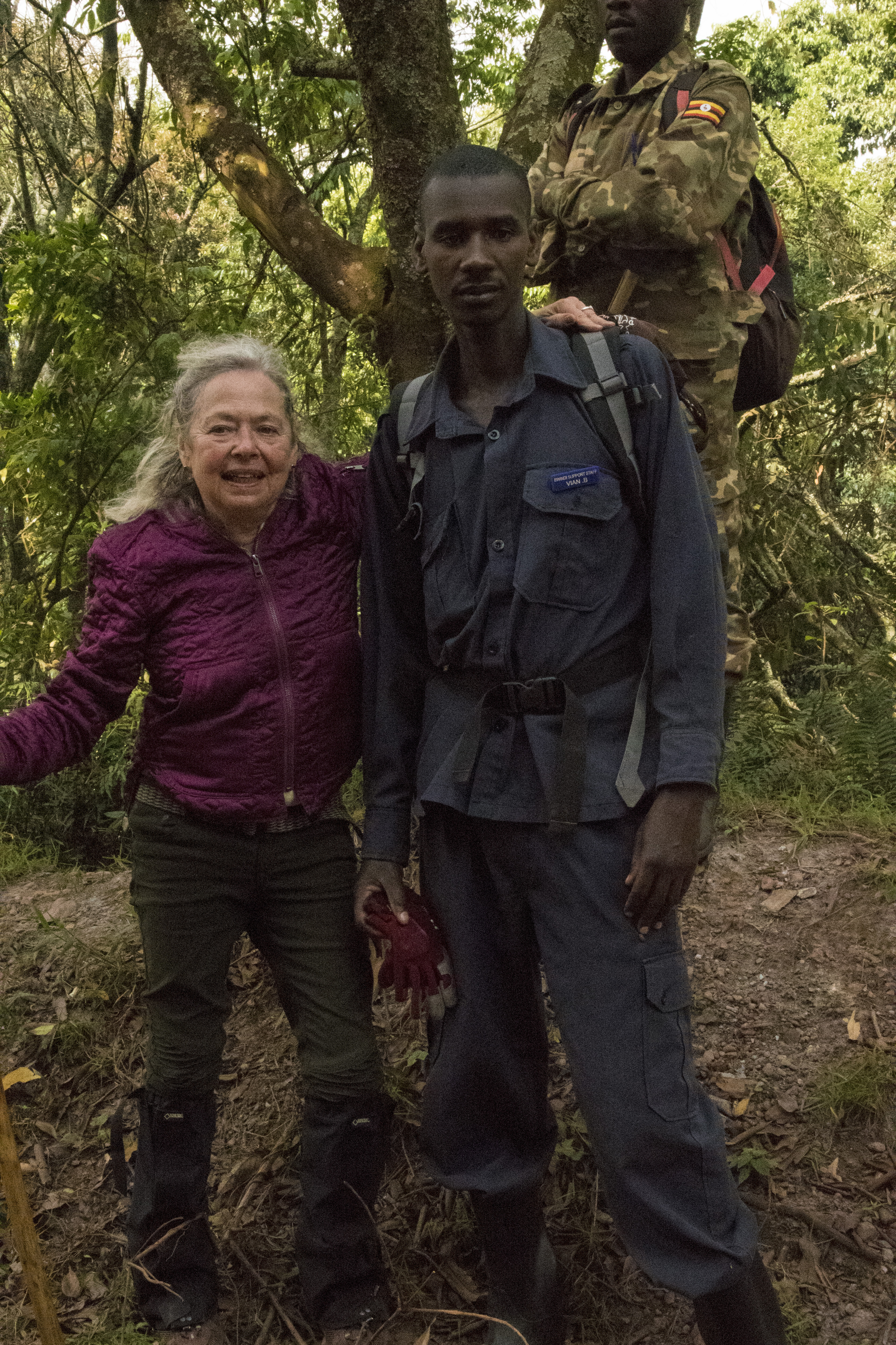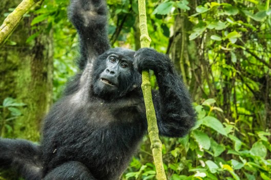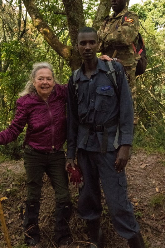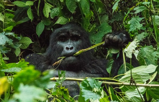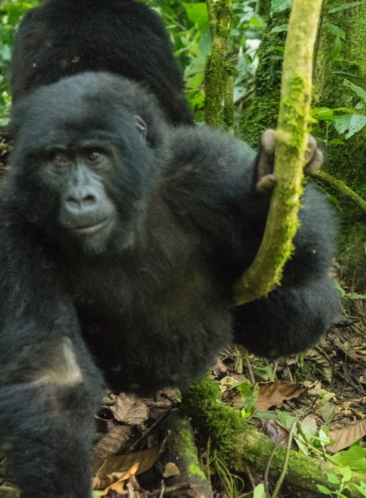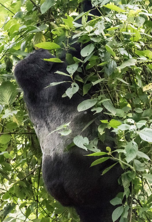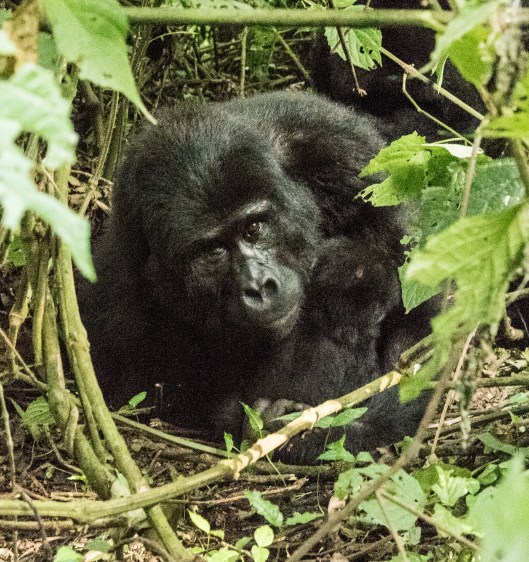 We got our permits to track a gorilla family in the Bwindi Impenetrable National Park in Uganda a few months ago. When the actual morning arrived Joanne was so excited she was breathless. It is known to be a difficult hike which added to her anxiety so we hired a porter to help her with her footing and hold on to the camera. It turned out to be extremely challenging with steep ravines and spongy undergrowth. Gloves were vitally important since you have to grab at the hanging vines to keep from tumbling down the incredibly steep mountain slopes. Our objective was to find the 15-member Kyaguriro gorilla family led by a silverback called Rukara. There were 8 of us adventurers plus a ranger guide, trackers, and porters. We would find the gorilla family and then have a little over an hour to spend with them.