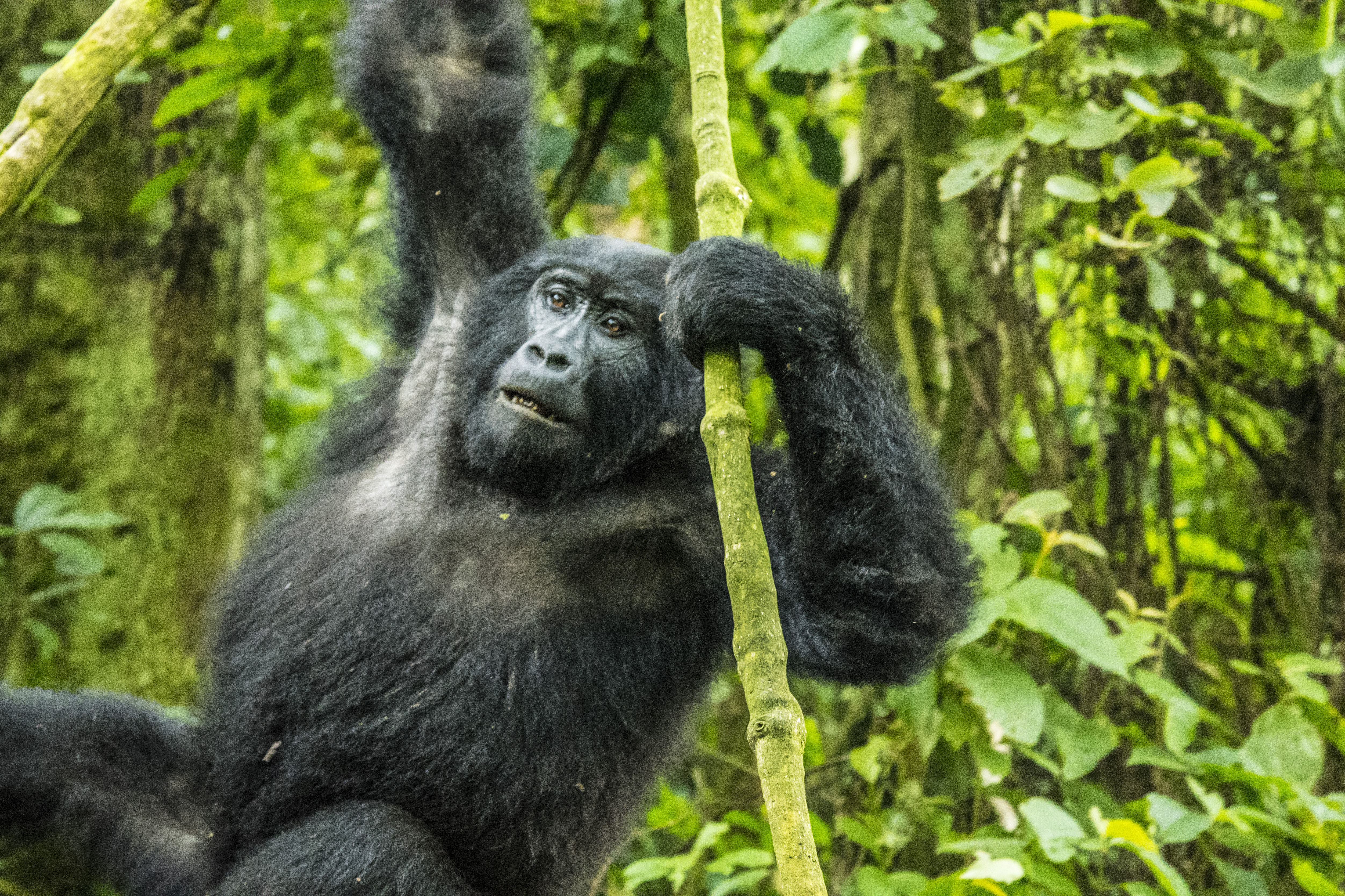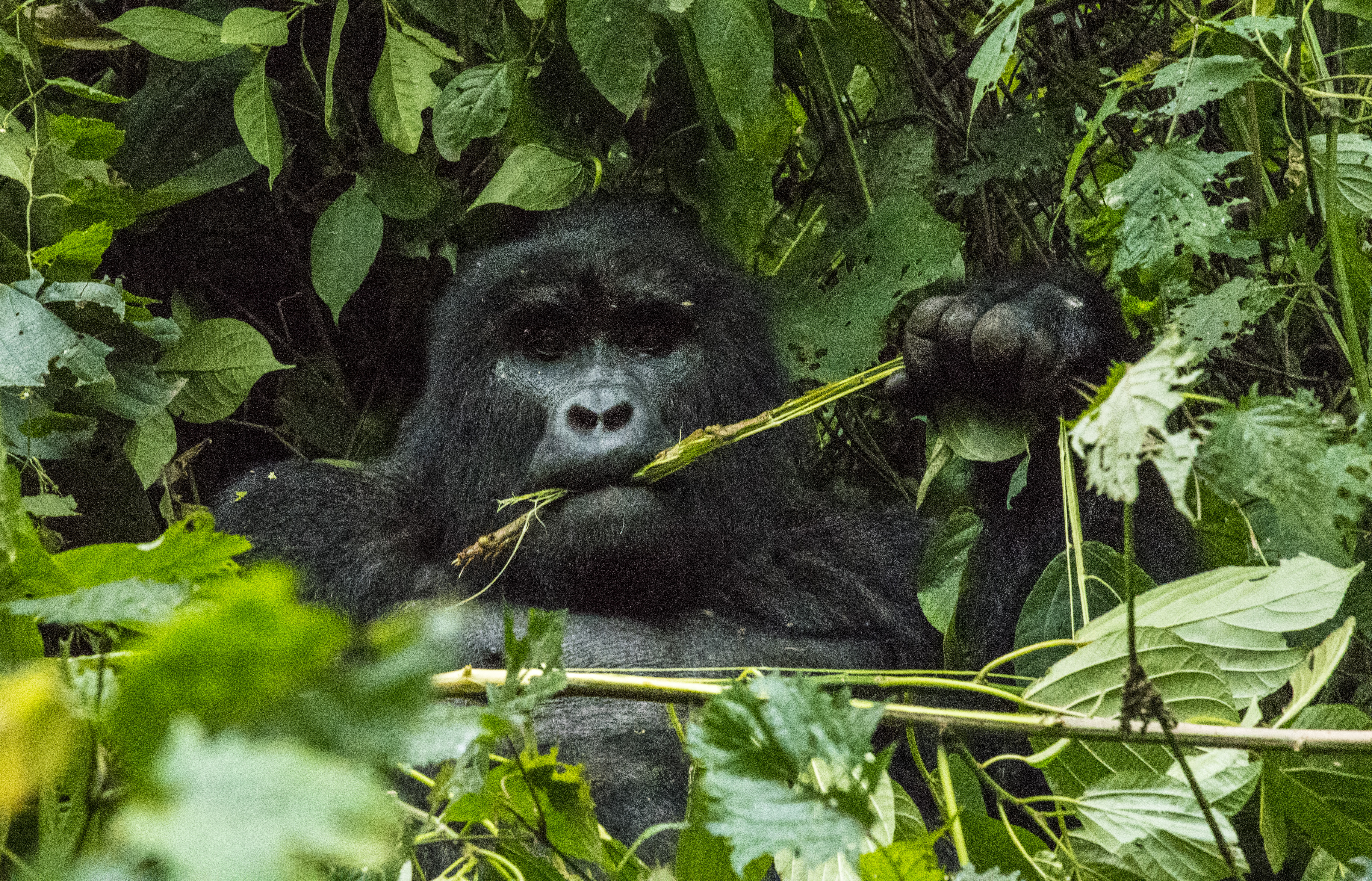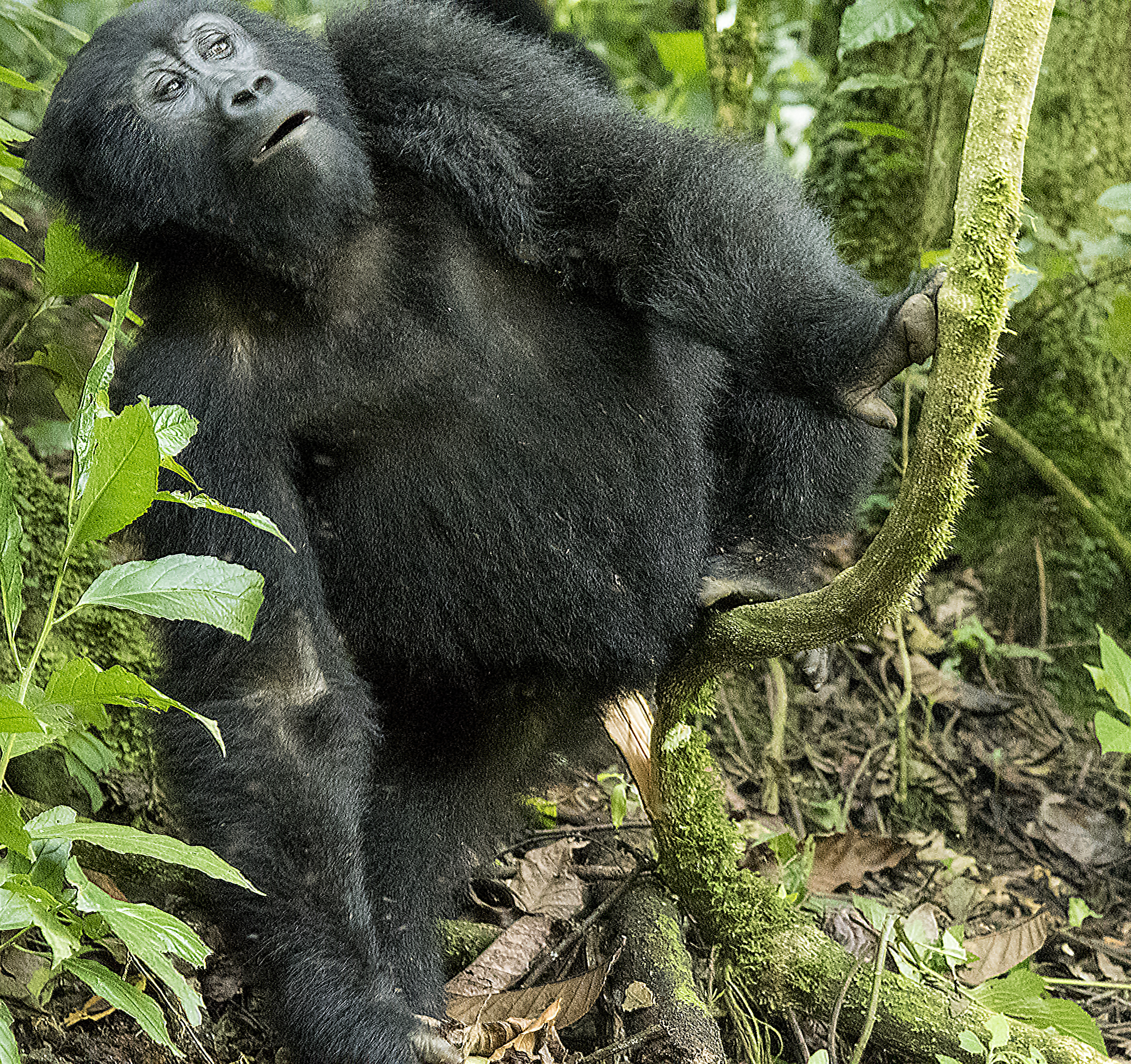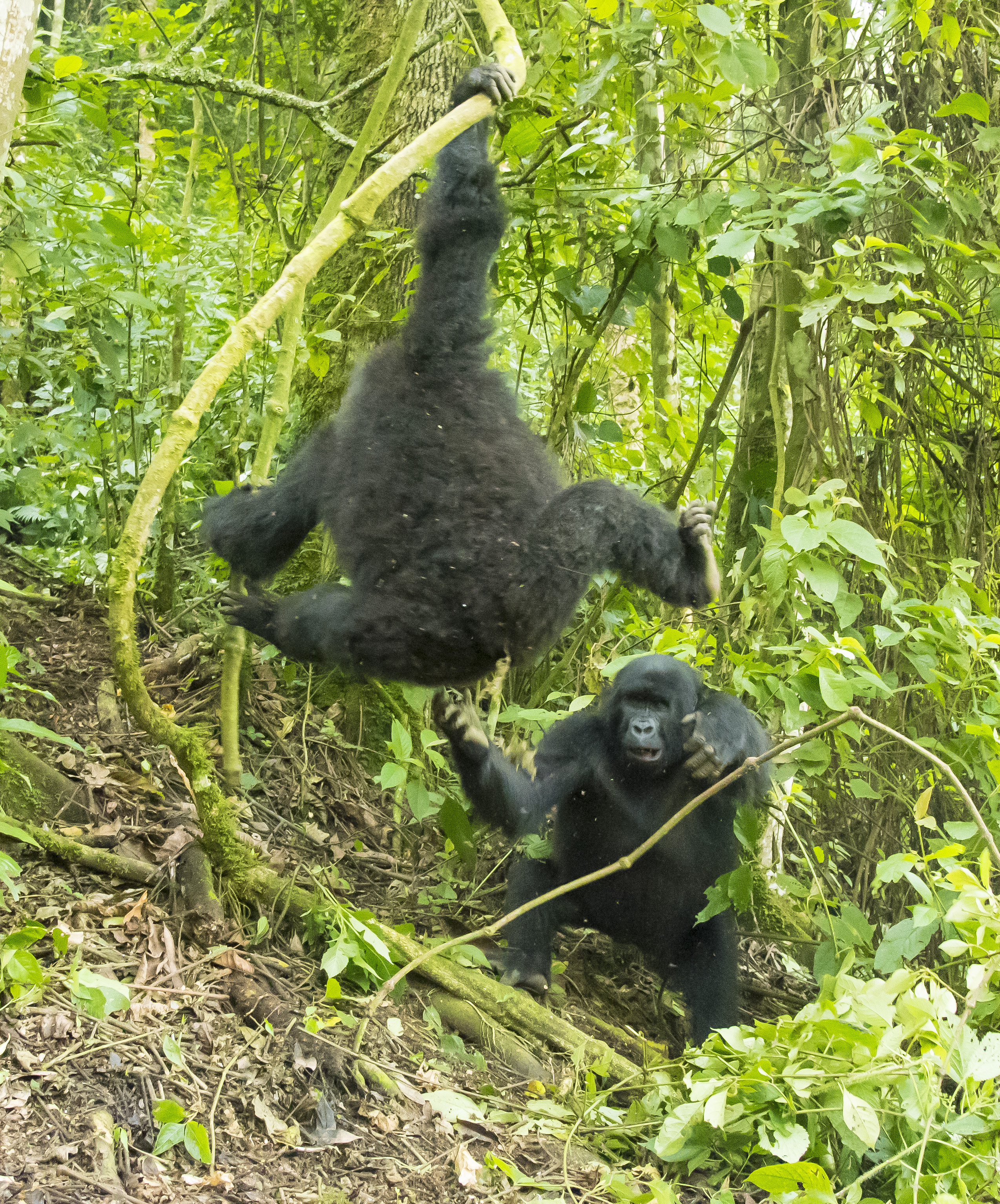 The Impenetrable National Park is a World Heritage Site and is aptly named. This view is from the road. The descent is very steep and dark. There are no well-beaten trails to follow. Just bushwhacking behind the trackers who chop away at the growth with machetes.