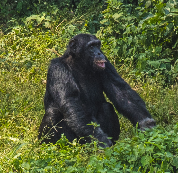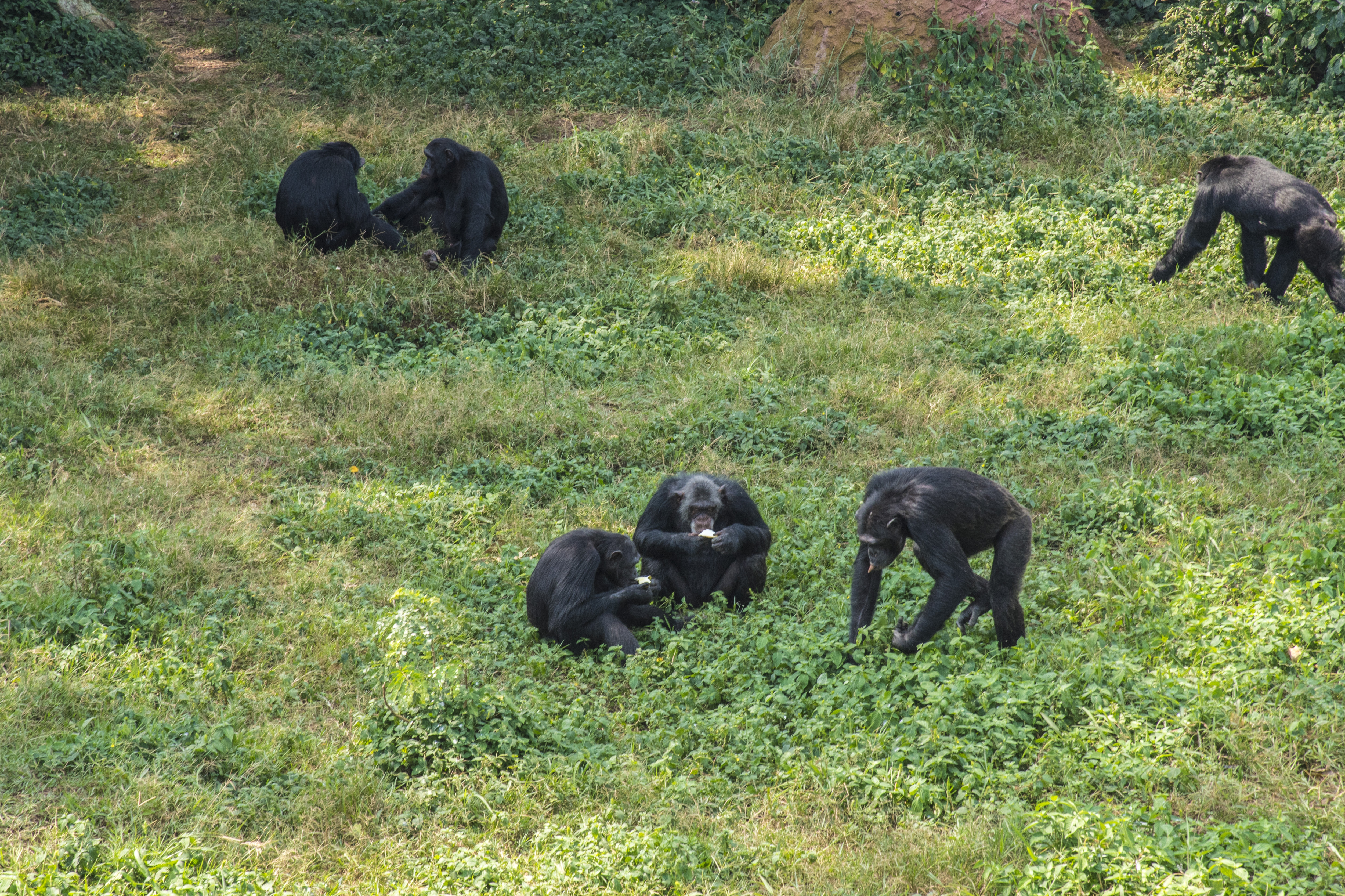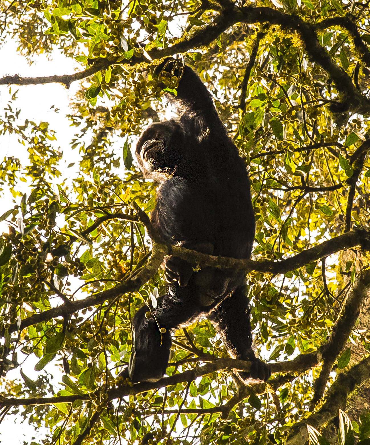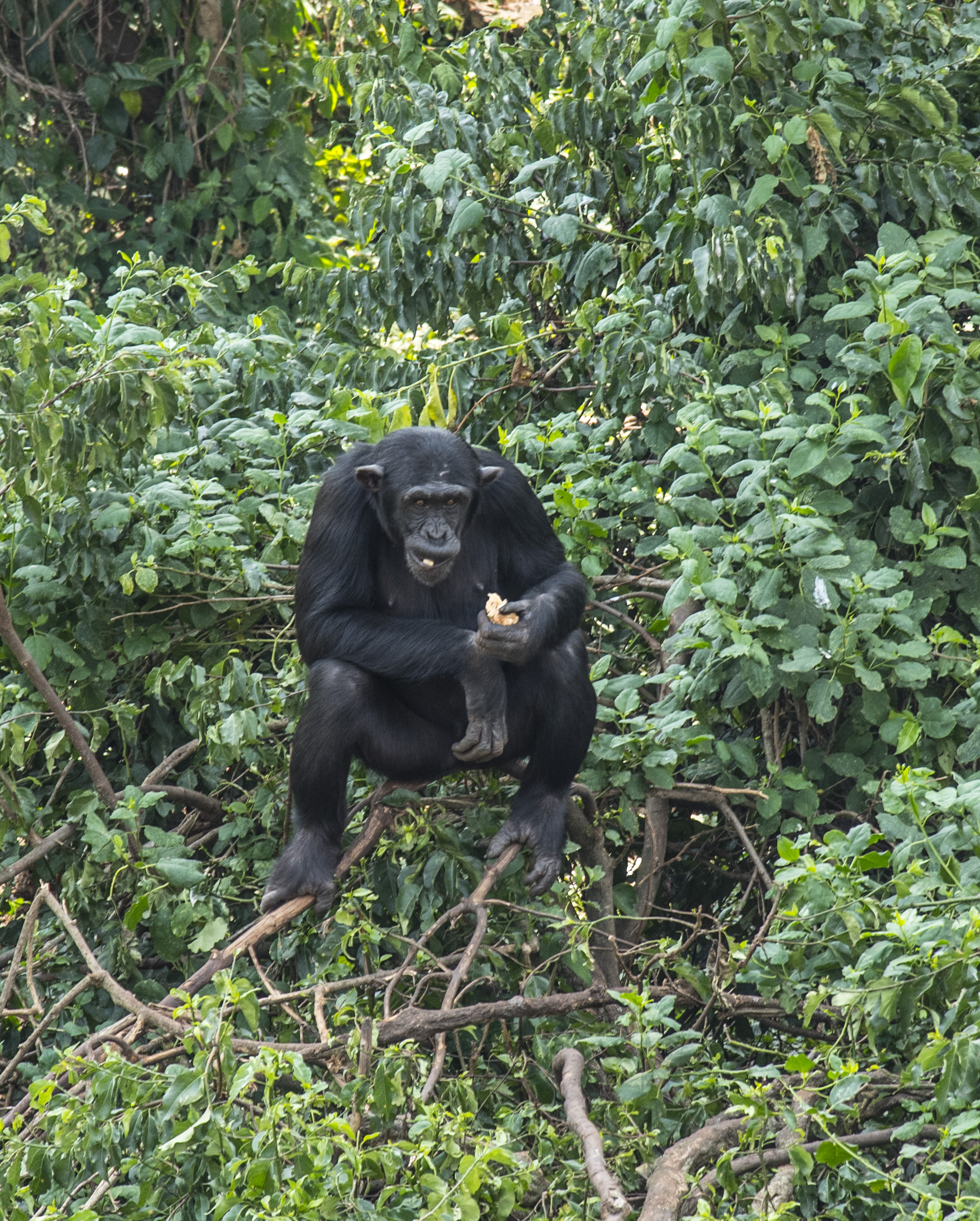 As humans we share 98.8 percent of our DNA with chimpanzees. To get a closer look at our tree climbing relatives, we went chimpanzee tracking in the wild at the Kyamburu Gorge near Queen Elizabeth National Park, Uganda. We found these primates to be elusive, far less friendly than the gorillas. Photographing them proved difficult because they stayed high up in the trees and when they did descend they immediately took off. The chimp in the above photograph did show some interest and hovered above us but then ran deep into the undergrowth when startled by one of the other visitors. Later in the trip we visited Ngambia Island, a chimpanzee sanctuary in Lake Victoria which is an hour and a half boat ride from Entebbe.