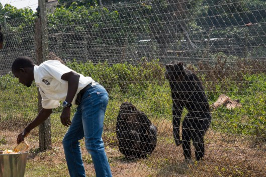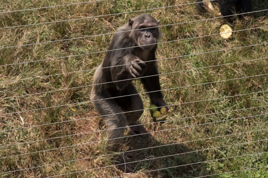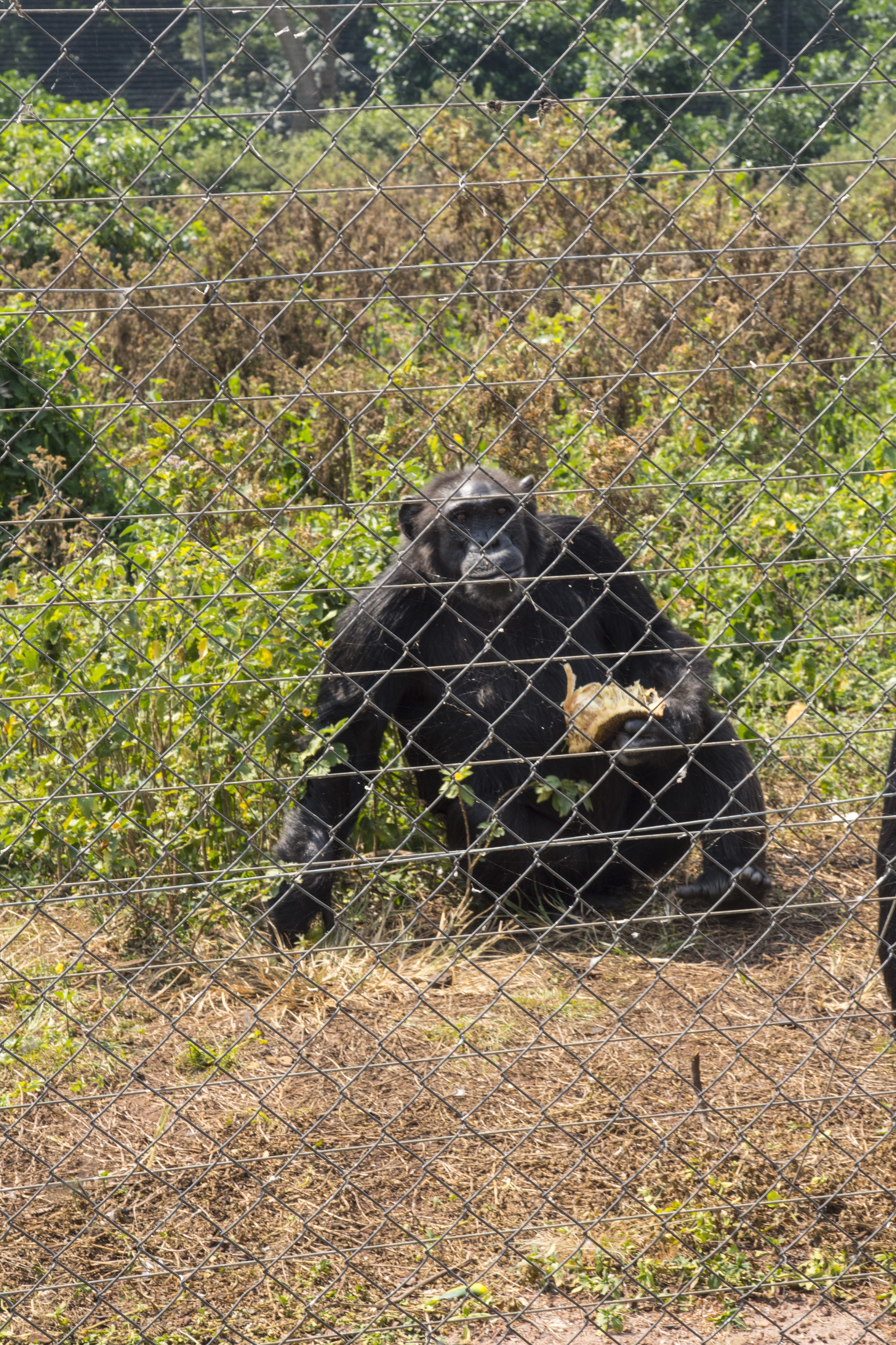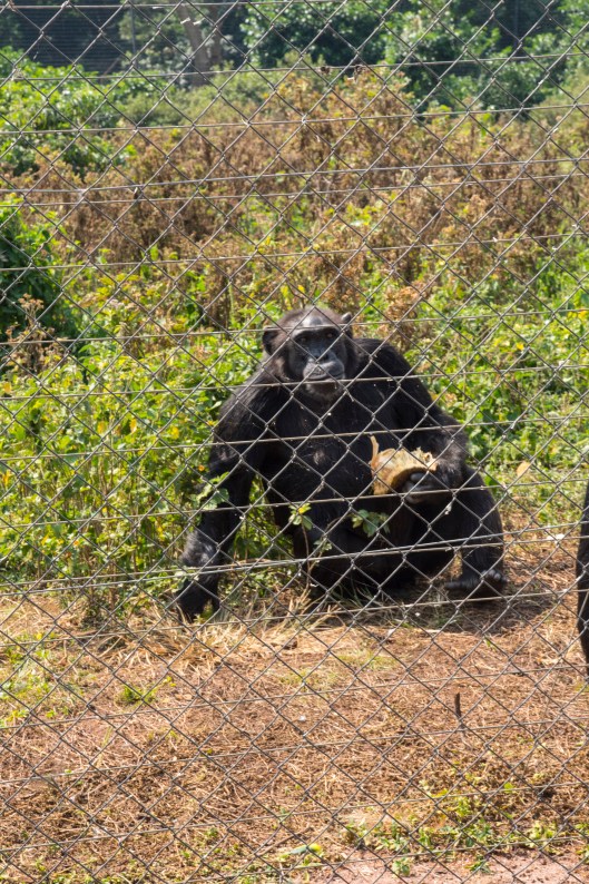 The chimpanzees here were all rescued from dire situations such as having been kidnapped by poachers when they were babies or abandoned by disillusioned pet owners who got more than they bargained for. Chimps are not good candidates for household pets. They are aggressive and can attack when irked. Yes, they do fight. There is a clear pecking order and fights for individual and group dominance are common. Staff members showed us some of their own scars. The are 49 chimps on the island with a limited amount of territory (100 acres of jungle), really not enough for a sustainable balance. Hence, the need for careful oversight.
