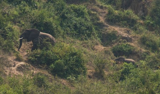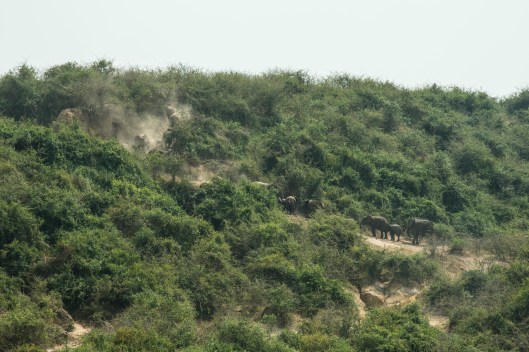It was a very hot day. We saw a large herd of elephants make their way down a rather steep slope to the water only to turn quickly around. Was it because our boat was there and they had a tiny baby? As we noted before, elephants are very protective of their little ones.