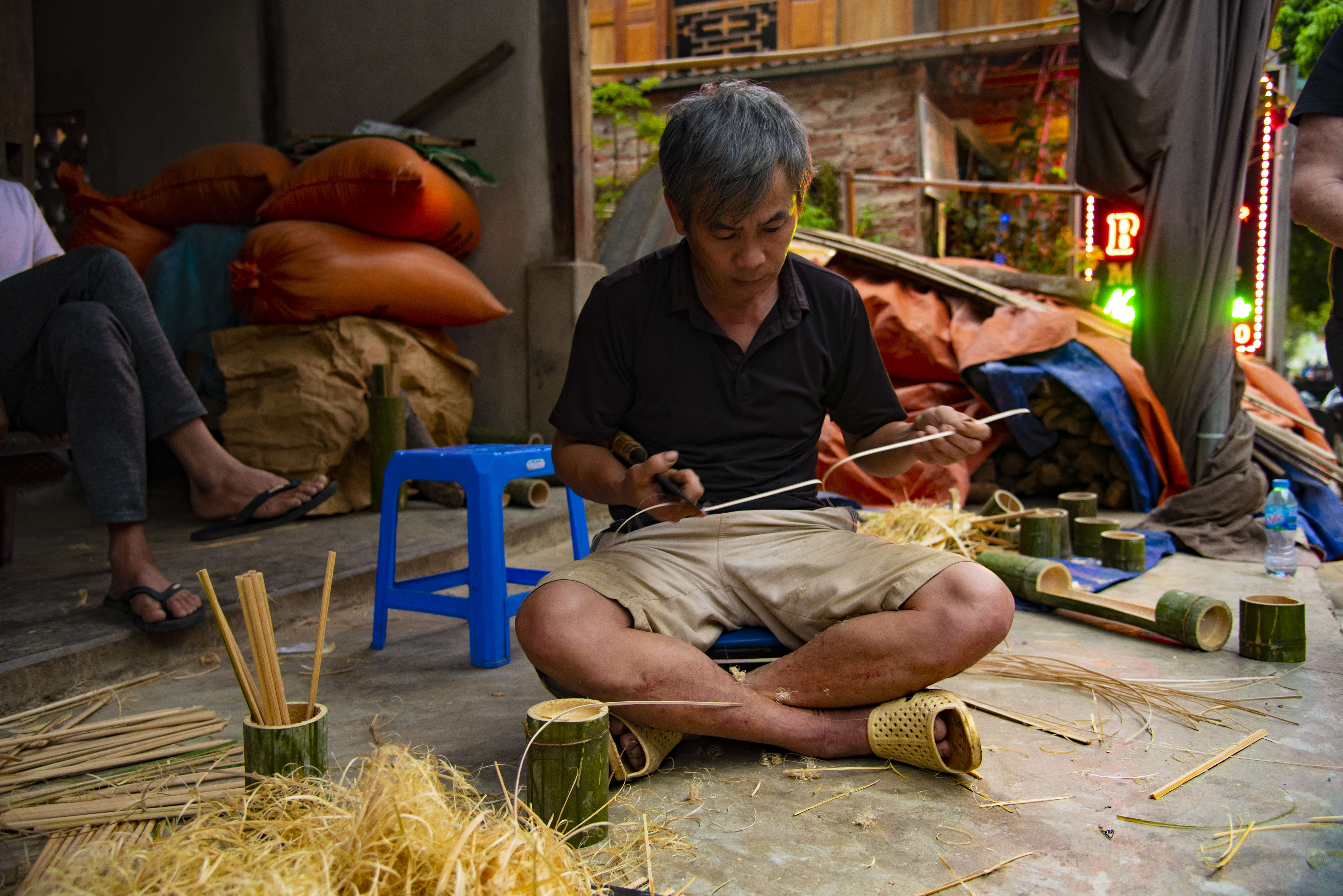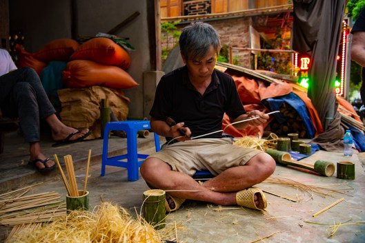 In the evening the village square became a lively place with local craftspeople creating and selling their wares. This man is making bamboo chopsticks.