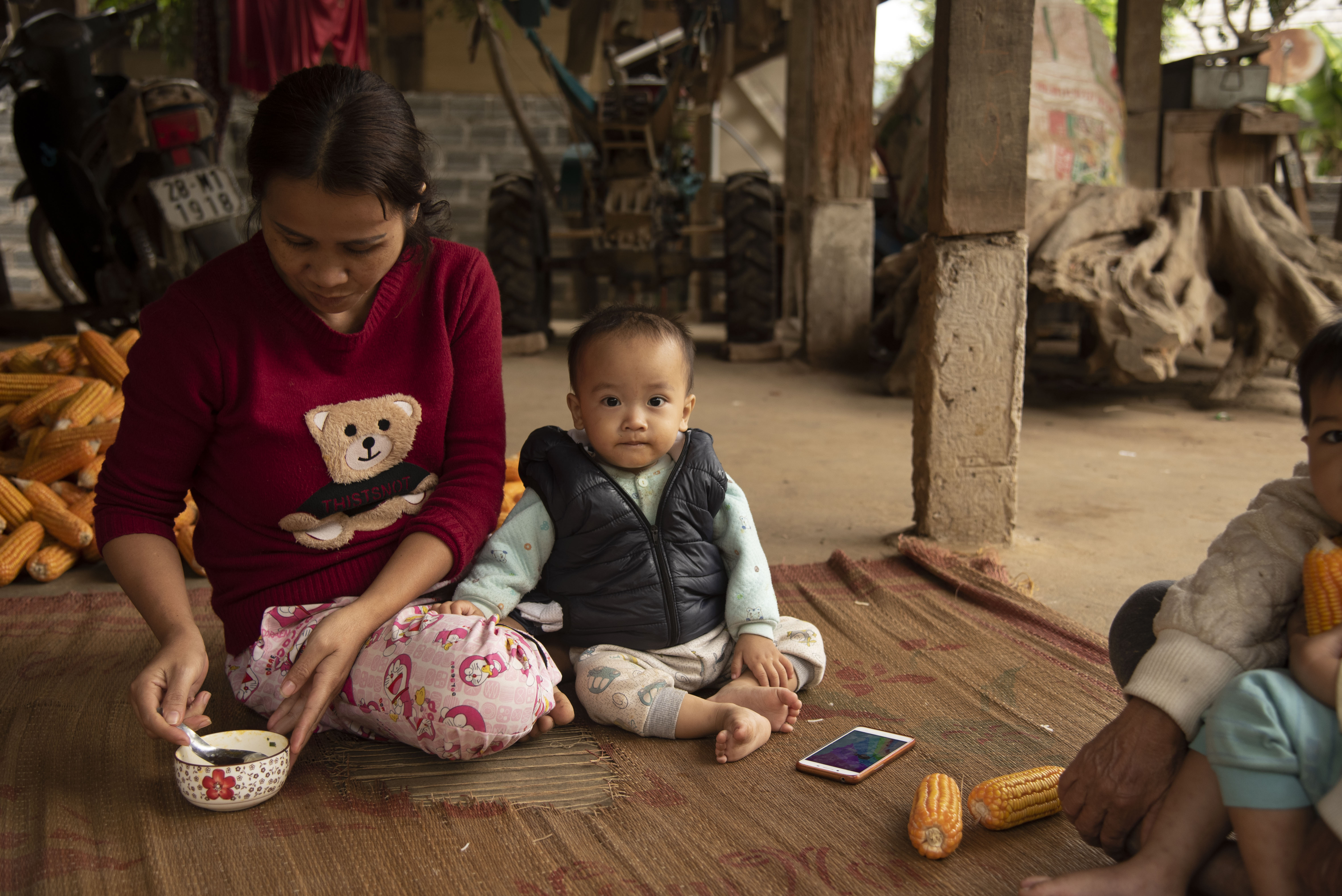 A mother feeds her little boy. Cell phones are ubiquitous.