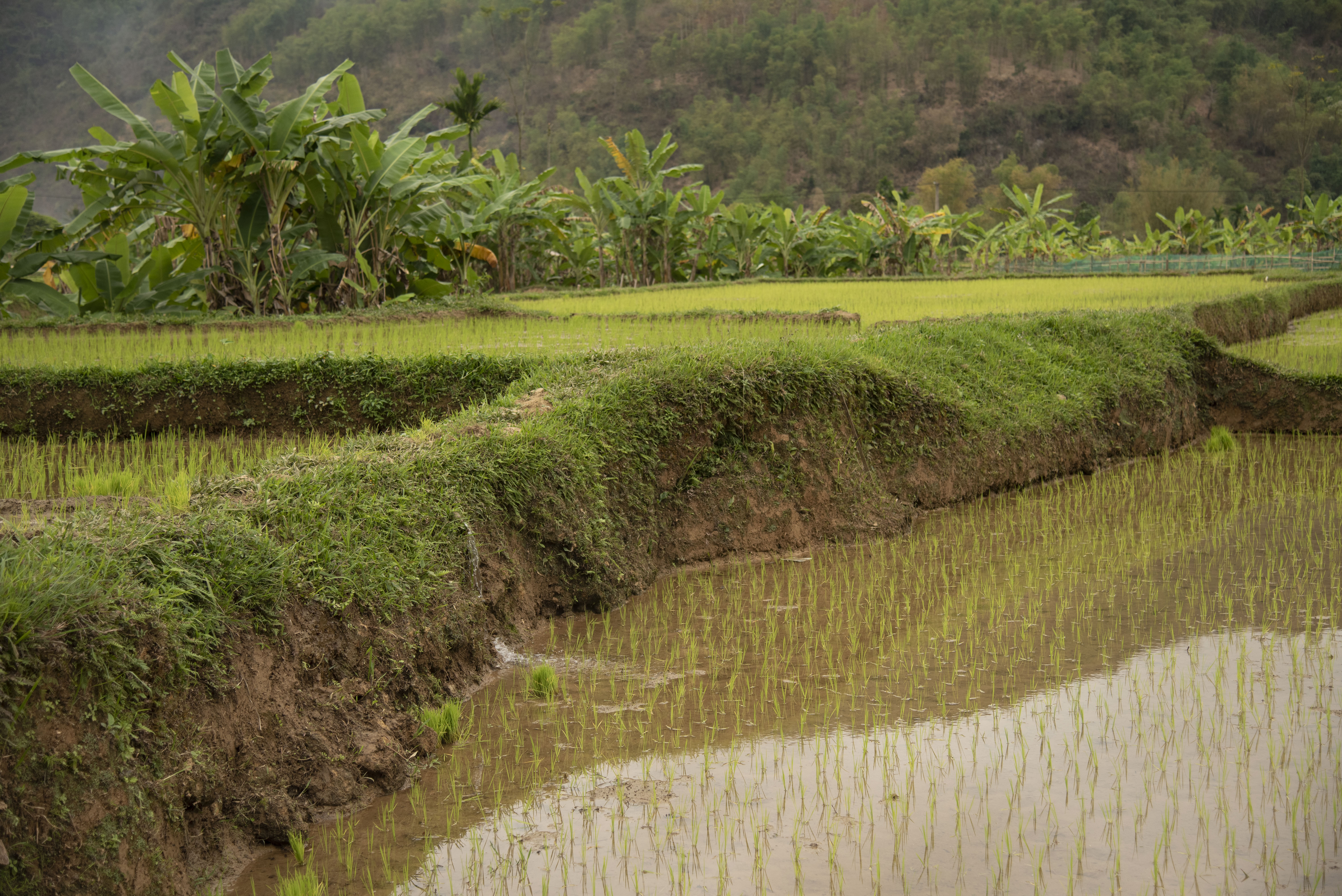 Clay dikes, which require constant maintenance, contain and control the water for irrigation.
