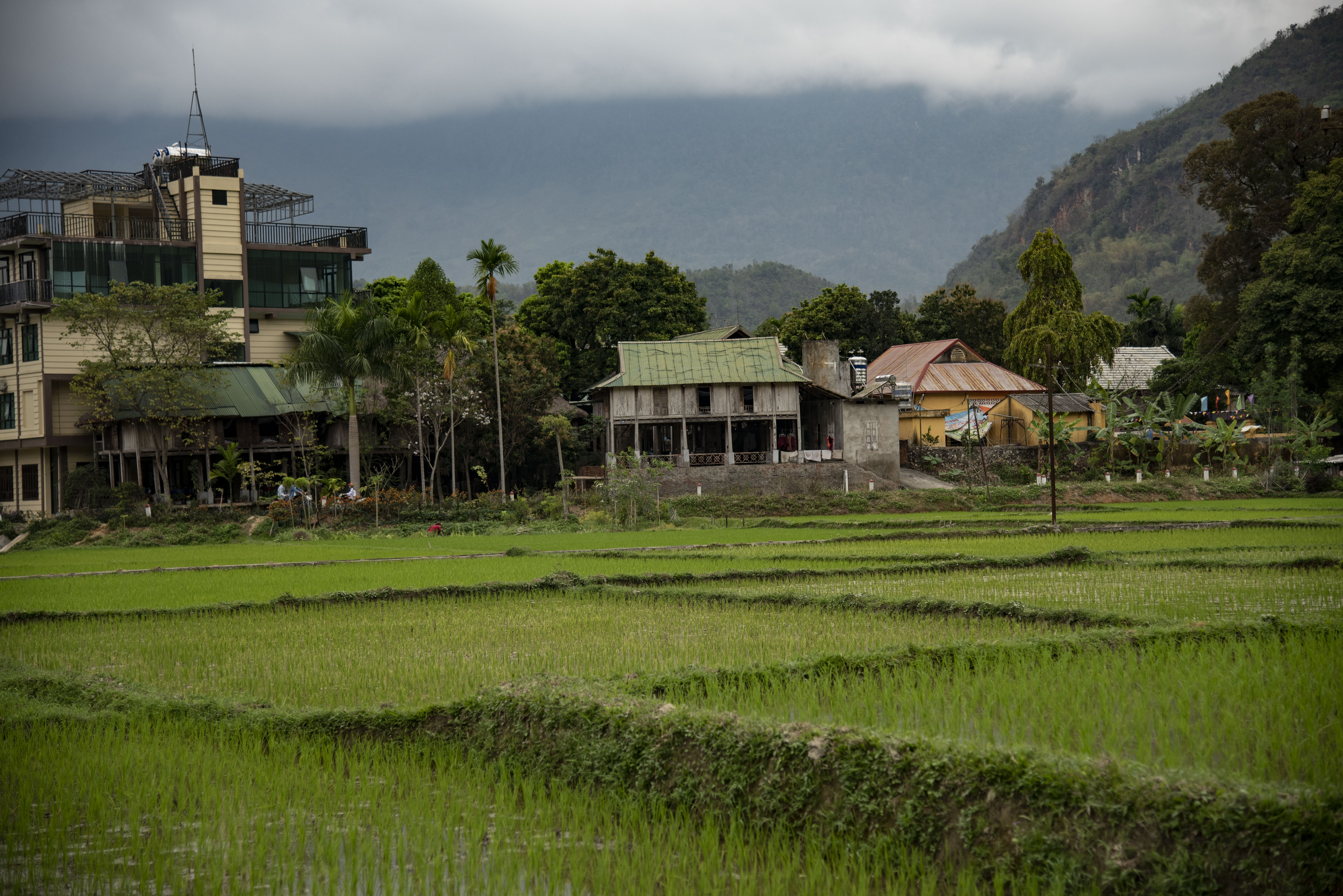 A number of small buildings border the rice fields. Our homestay is the building on the left.