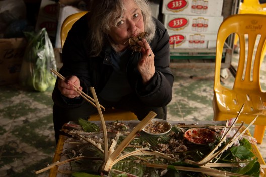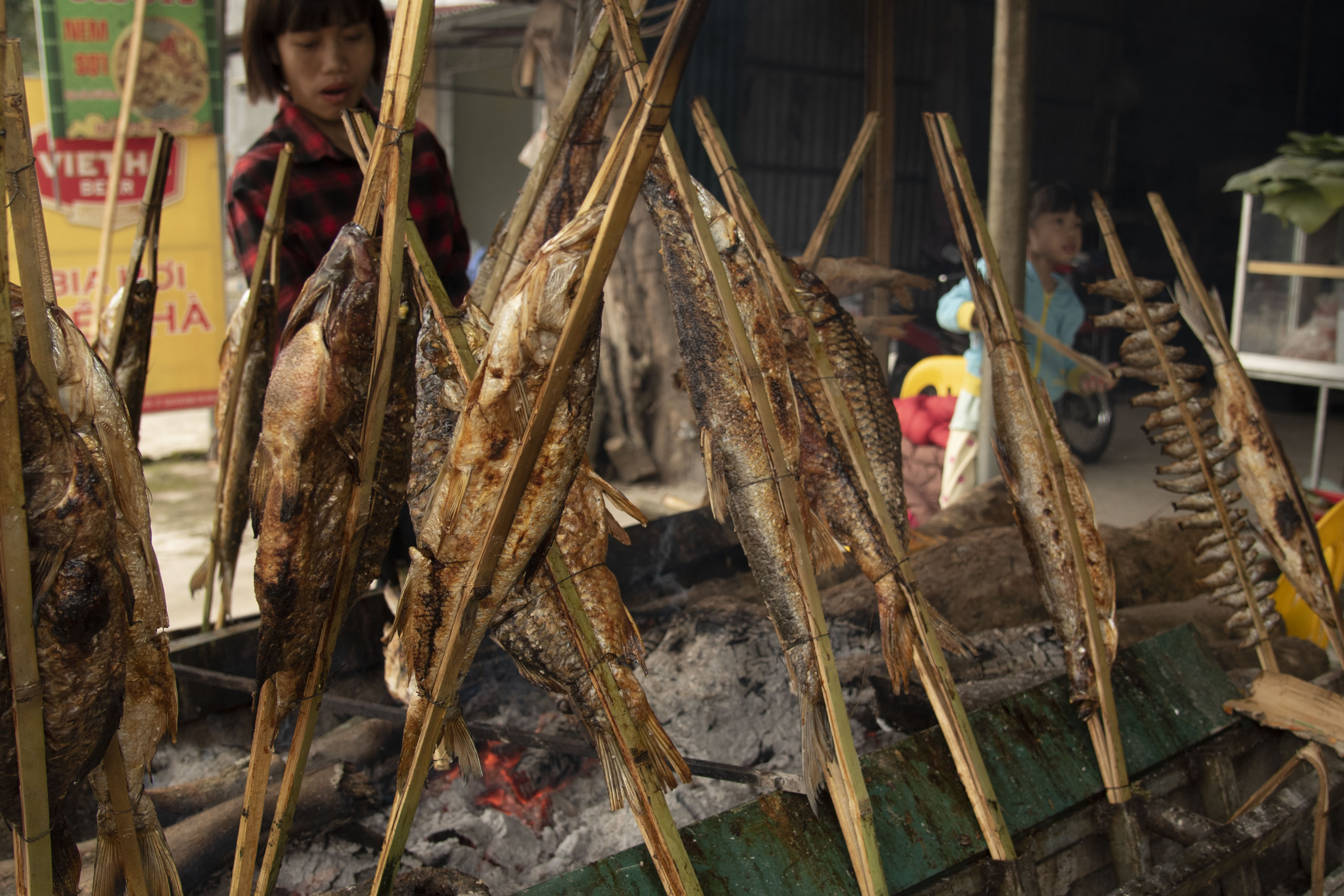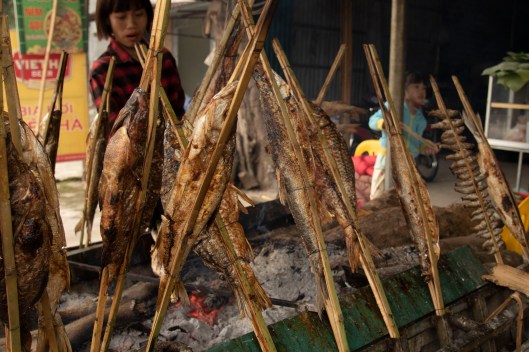 The day after landing in Hanoi on February 22nd we began our one-month journey in Vietnam with a three-hour overland drive to the district of Mai Chau which is southwest of the city. On the way we stopped to chat with a local farm family, ate at a roadside stand smoking fresh fish, and visited a broom factory next to the fish stand.