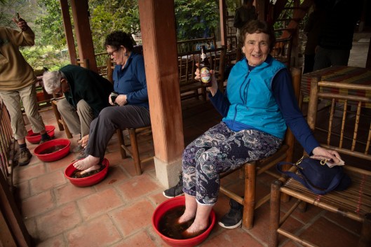After a long day we relaxed with a beer and soaked our feet in an herb bath. This is Pat and behind her are Anne and Larry. Jiji is partially shown. There were six of us on this week long pre-trip to the northern tribes organized by Overseas Adventure Travel (OAT). We would meet up with seven other travelers on February 28 for the main trip through Vietnam.