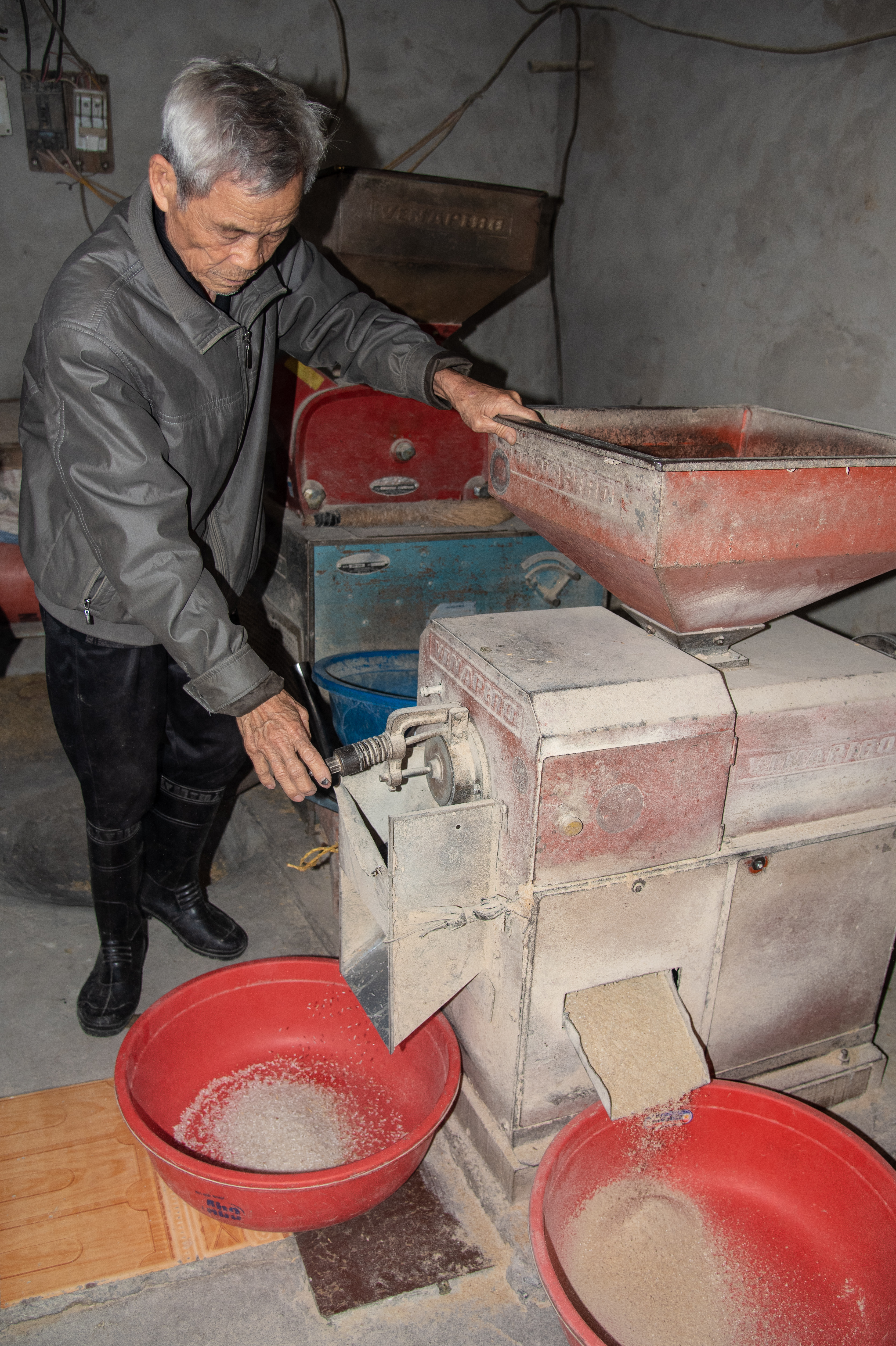 Mr. Hien’s neighbor processes rice brought to him by local farmers, separating the rice from the husks and breaking it down into edible kernels and rice flower.