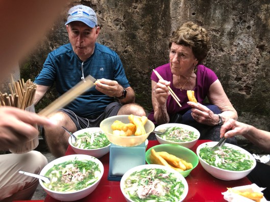 Fellow travelers Kieran and Pat enjoying their Pho. We sat on tiny plastic chairs in a narrow public alley a short distance from Het Pho, which bring the pho to you along with very delicious rice crisps and hot peppers.