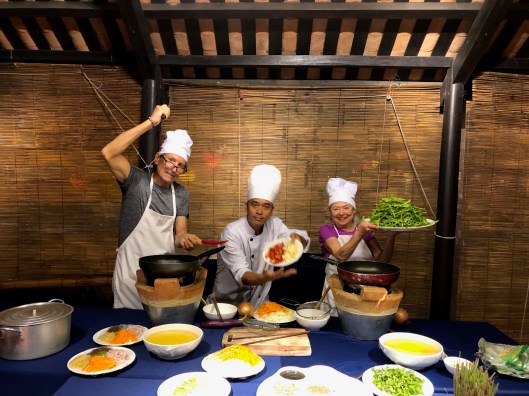 We took a Vietnamese cooking class at the Hoi An Silk Village and learned how to make Lang Lua (spring rolls), grilled fish in banana leaf, and squid salad.