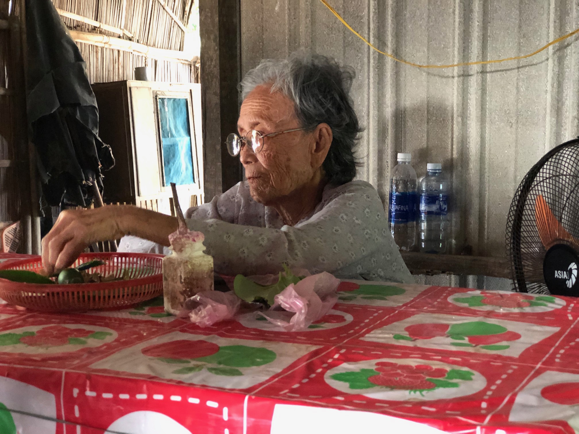 We took a cyclo-rickshaw ride to Cam Thranh Village, about five miles out of the center of Hoi An. This village was a Vietcong stronghold during the war. Those 20% of families who supported the South Vietnamese government were forced to leave. The women shown above left the village, while her son and husband were killed during the war. After the war, the woman was homeless and returned to Cam Thranh where her former neighbors gave her living quarters. She is seen doing her beetel nut preparation.