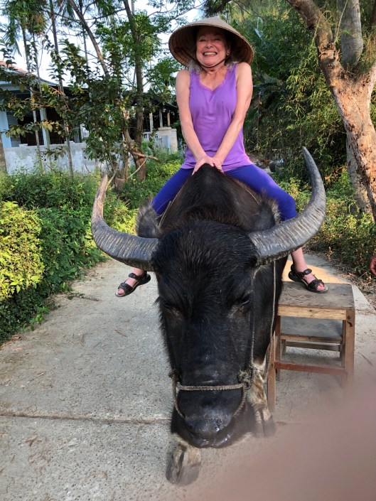 A nearby water buffalo, Bin, was just waiting for Joanne to climb on her back.