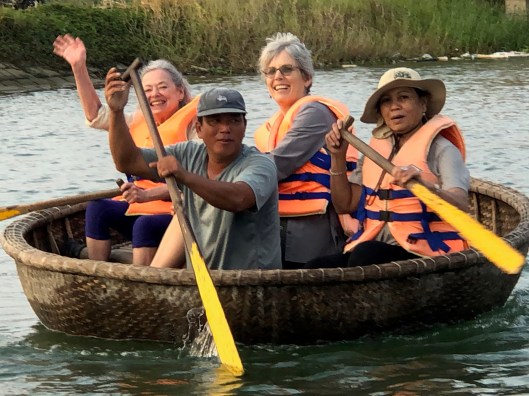 This is a basket boat, called a “thung chai.” The origin of these boats goes back to when the French levied taxes on boats in Vietnam The fishermen circumvented these taxes by designing circular woven “baskets” that just so happened to also function as boats.