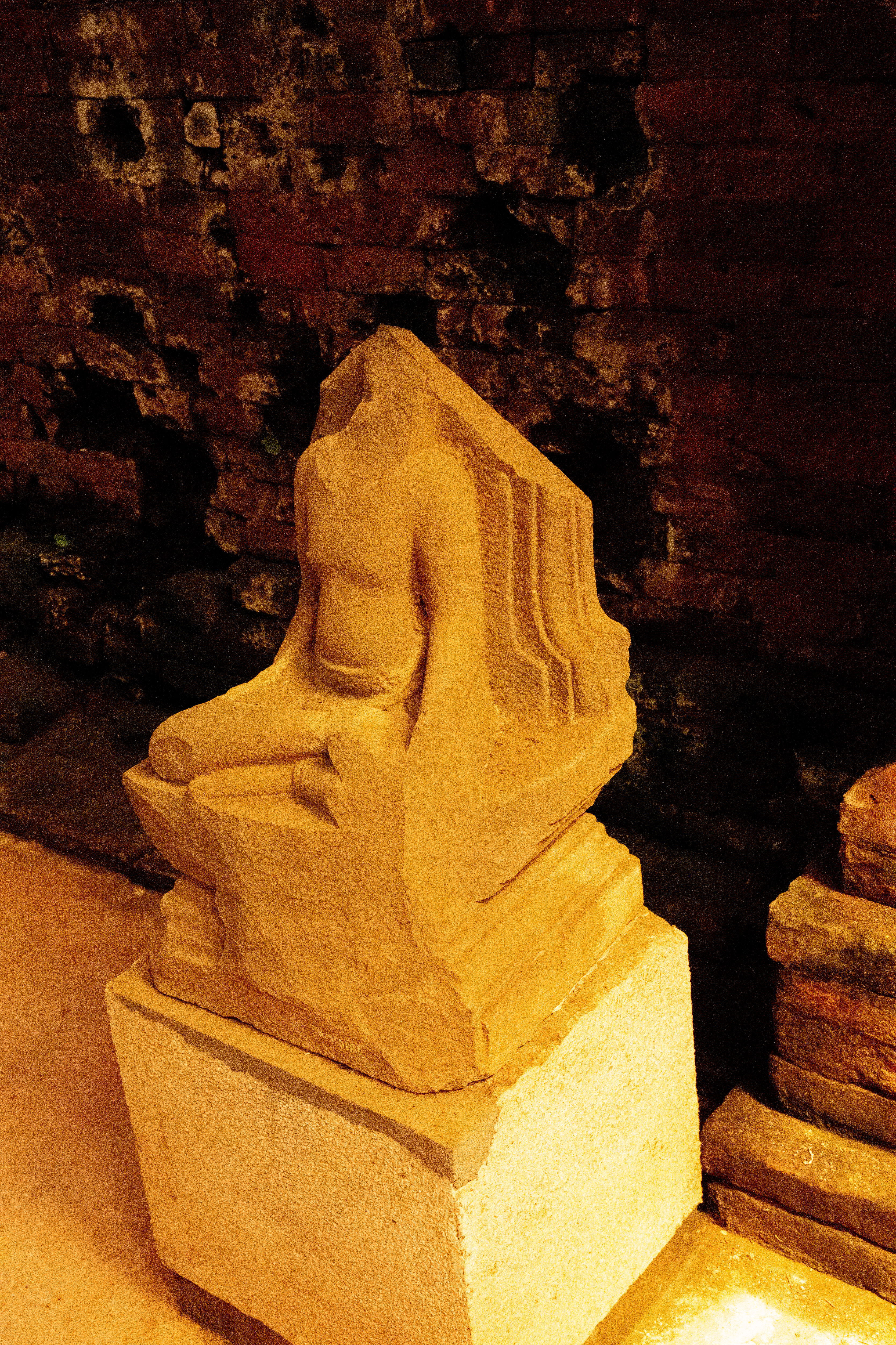 Probably a diety in lotus position carved from sandstone.