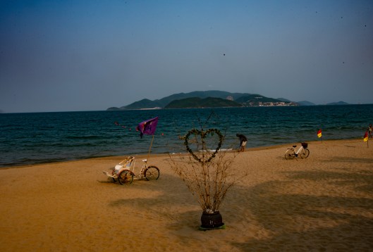 Nha Trang has a very pretty beach which the locals embellish with found art projects. Across the water is an expensive resort that features a large ferris wheel.