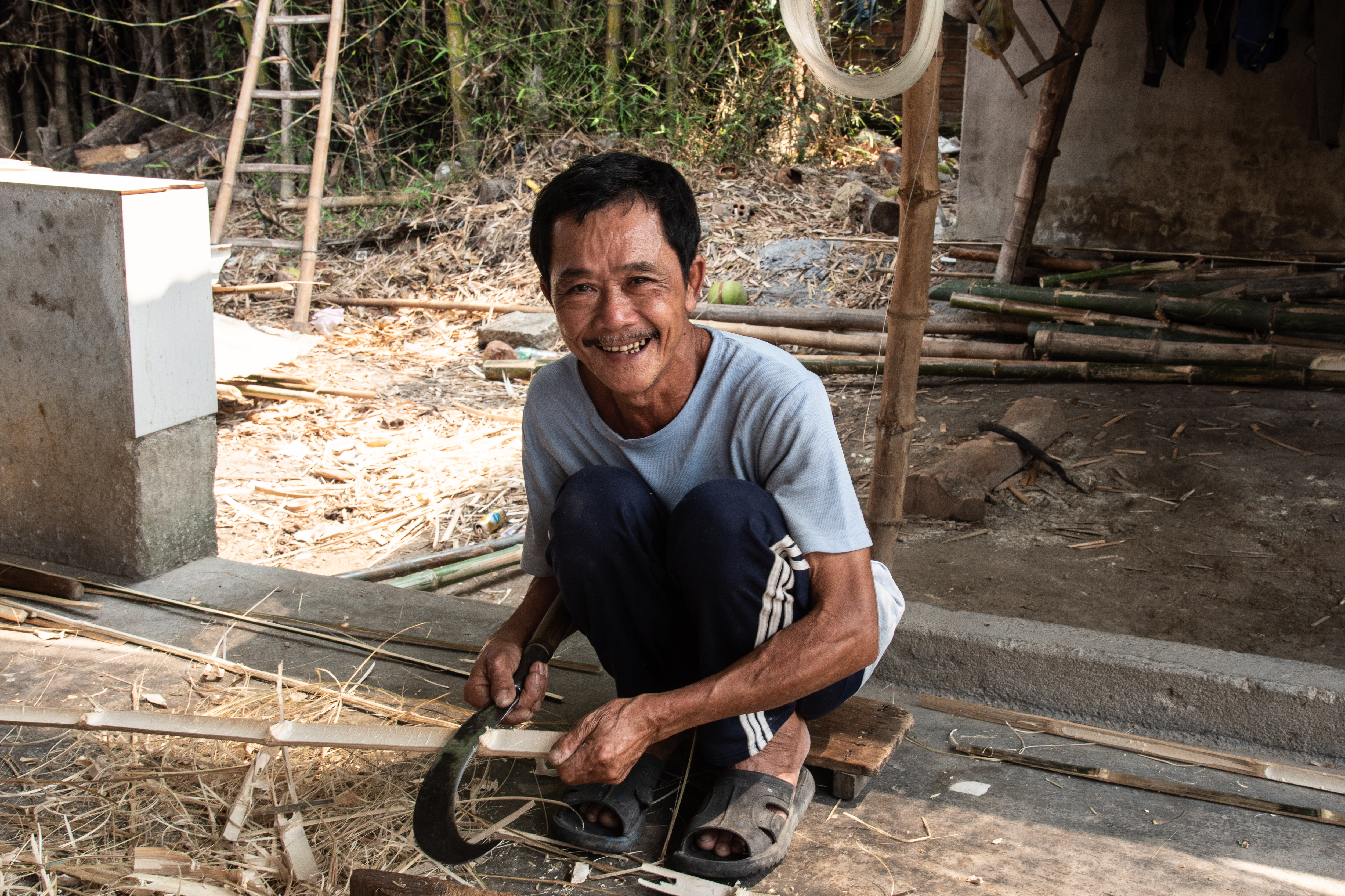 Splitting bamboo with a sharp scythe is a dangerous process that requires great dexterity.