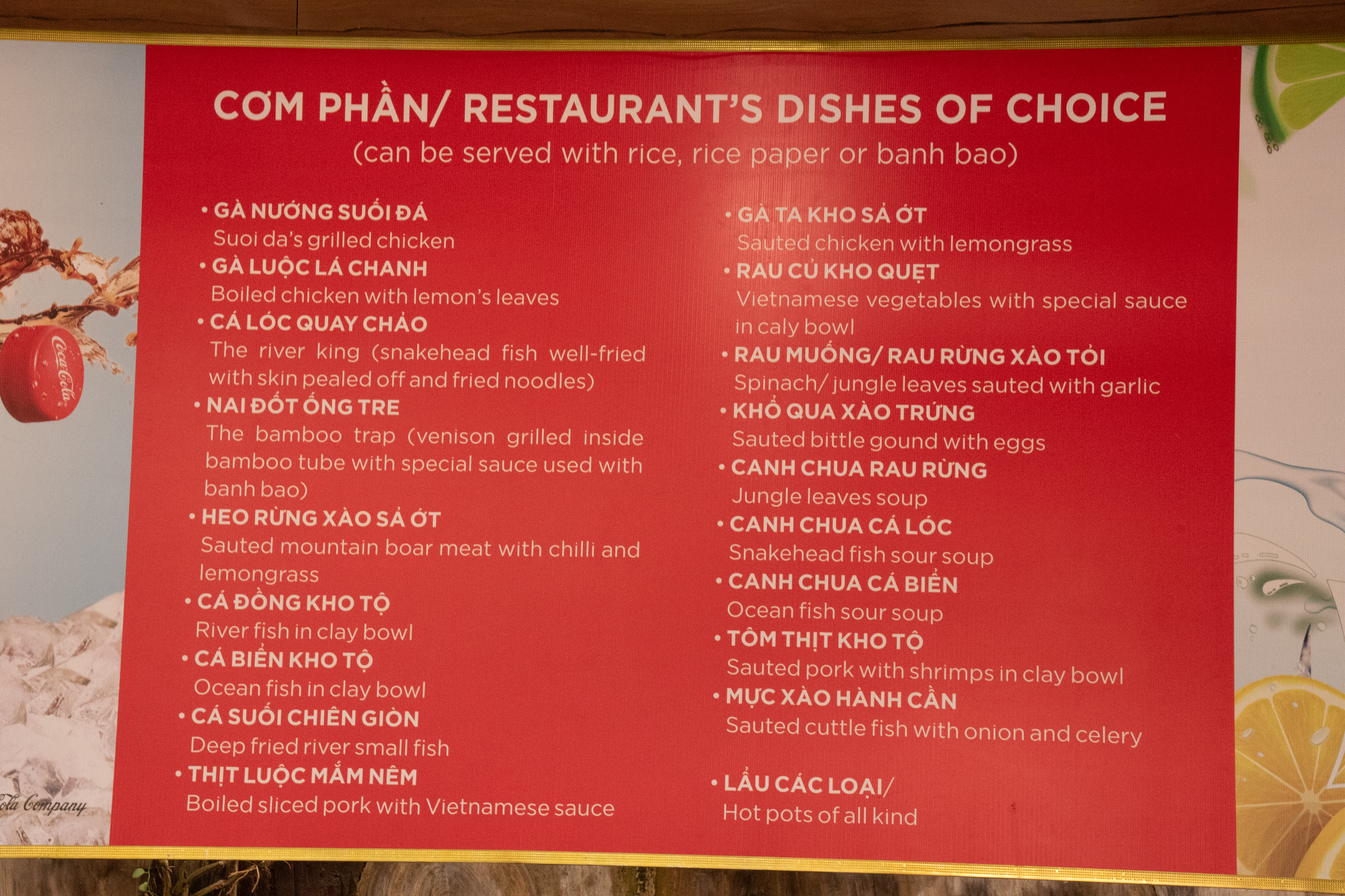 The menu, at this local tourist attraction, gives you an idea of the local cuisine.