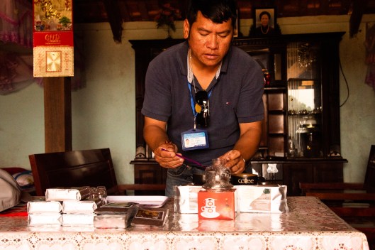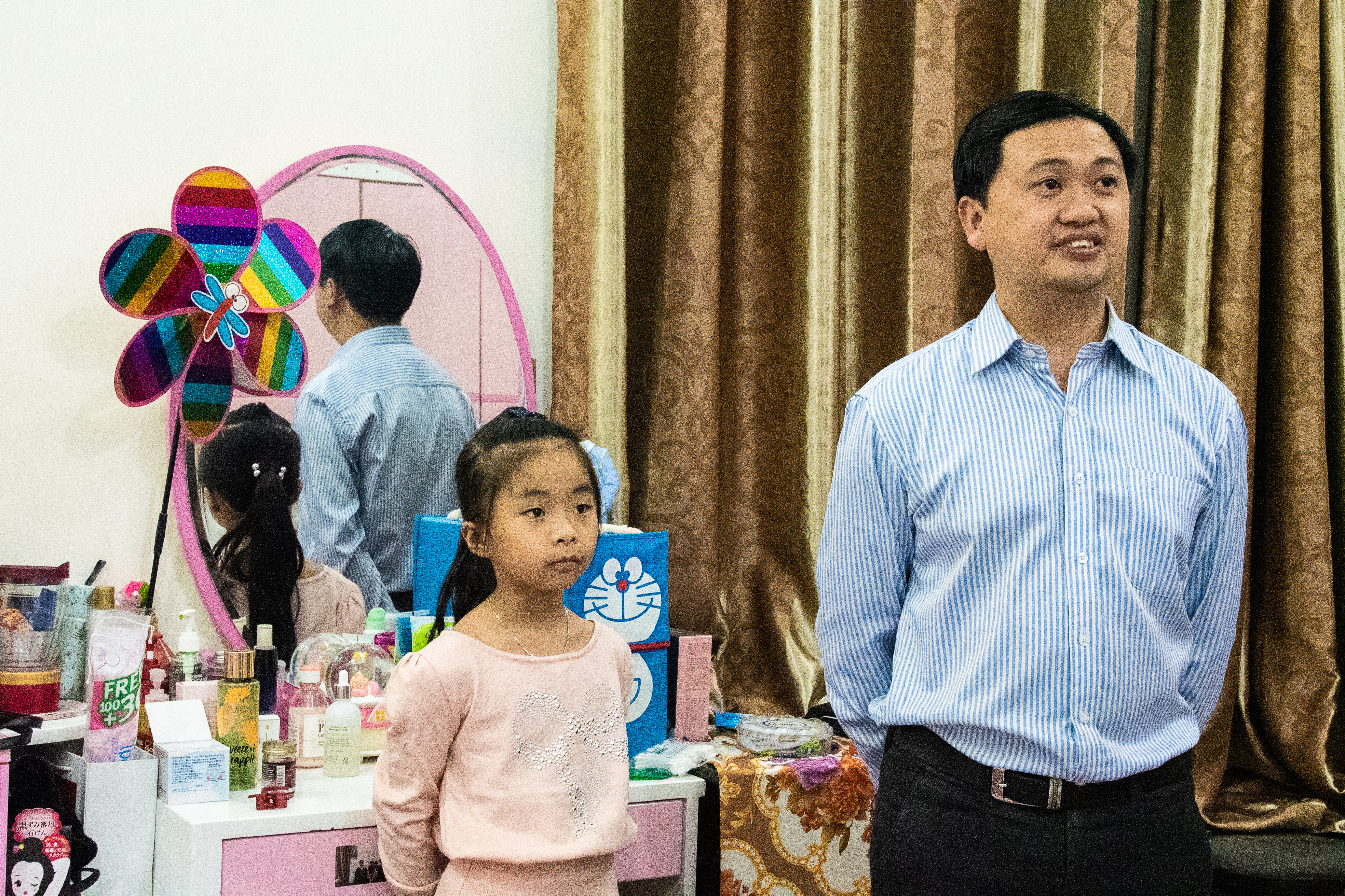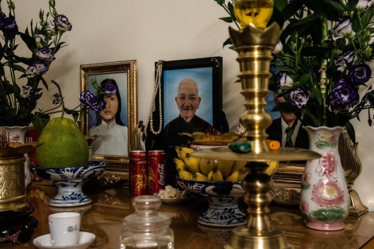 Shown above are the father and daughter. The house they live in is tall and narrow, in the Vietnamese style of building. There are four floors accommodating his parents, his younger brother and his wife, and the couple and their two daughters. Here the older daughter was showing us her room. The father explained to us that the two most important things are their ancestors and their children’s education. He works in the tech industry and his wife works in the medical field. The family also owns green houses. His mother, a former teacher, tutors the neighborhood children.