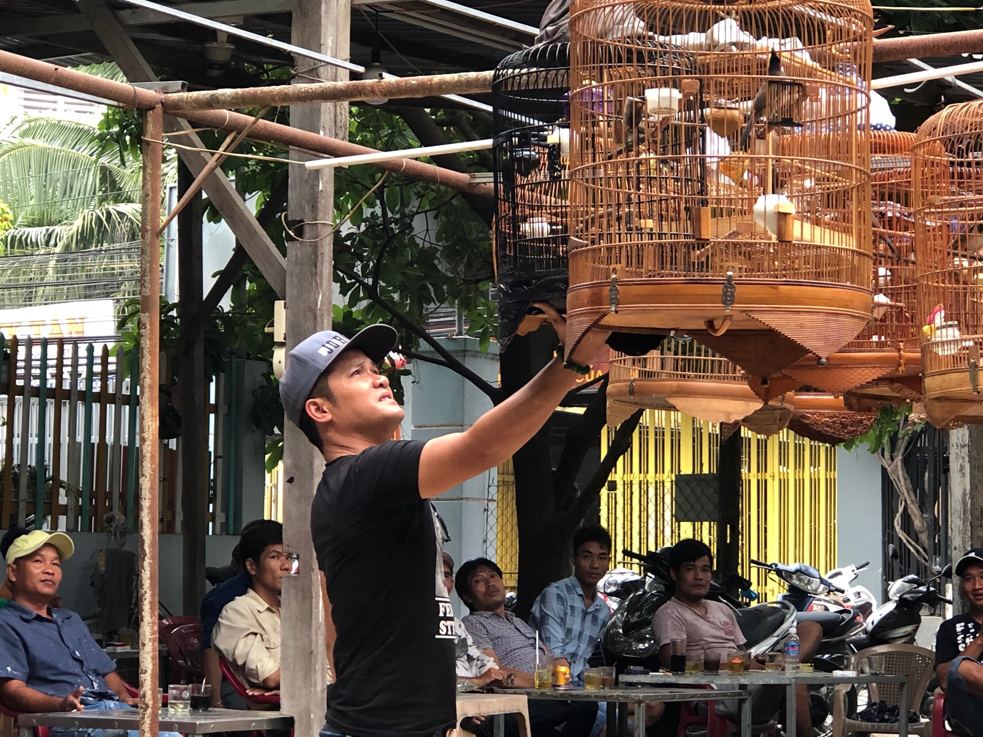 We took a short motorcycle ride to the bird coffee house, where workmen congregate with their pet song birds. It’s like a dog park for song birds, with each coffee house specializing in a particular type of song bird. Birds here are the Bulbuls.
