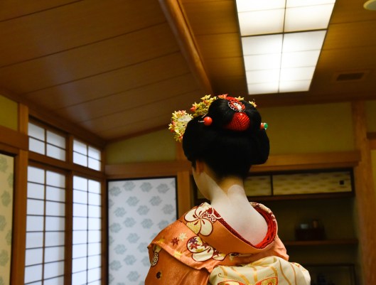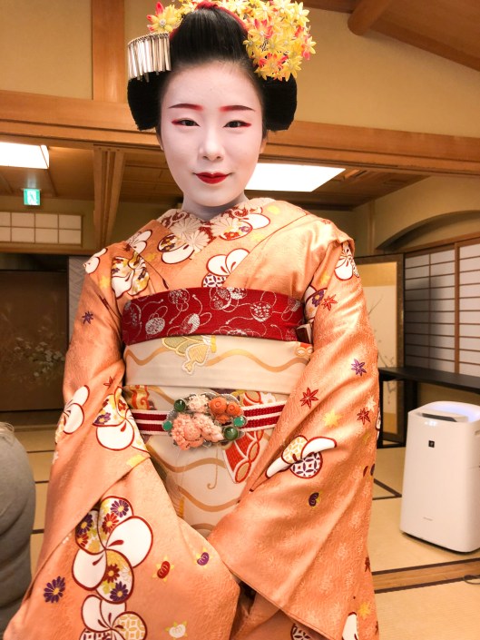 Upon our return to Kyoto we had lunch with this lovely young woman who is a Maiko in training to be a Gaiko (the term used for Geisha in Kyoto). She is 21 years old and has been an apprentice to enter the profession since she was 19. She described her lifestyle and how she lives in a communal house with other Maikos and Gaikos run by an older “mother” Geiko. The elaborate dress she wears is owned and taken care of by the head of the house. Her work involves attending and performing traditional songs, and dances at private events.