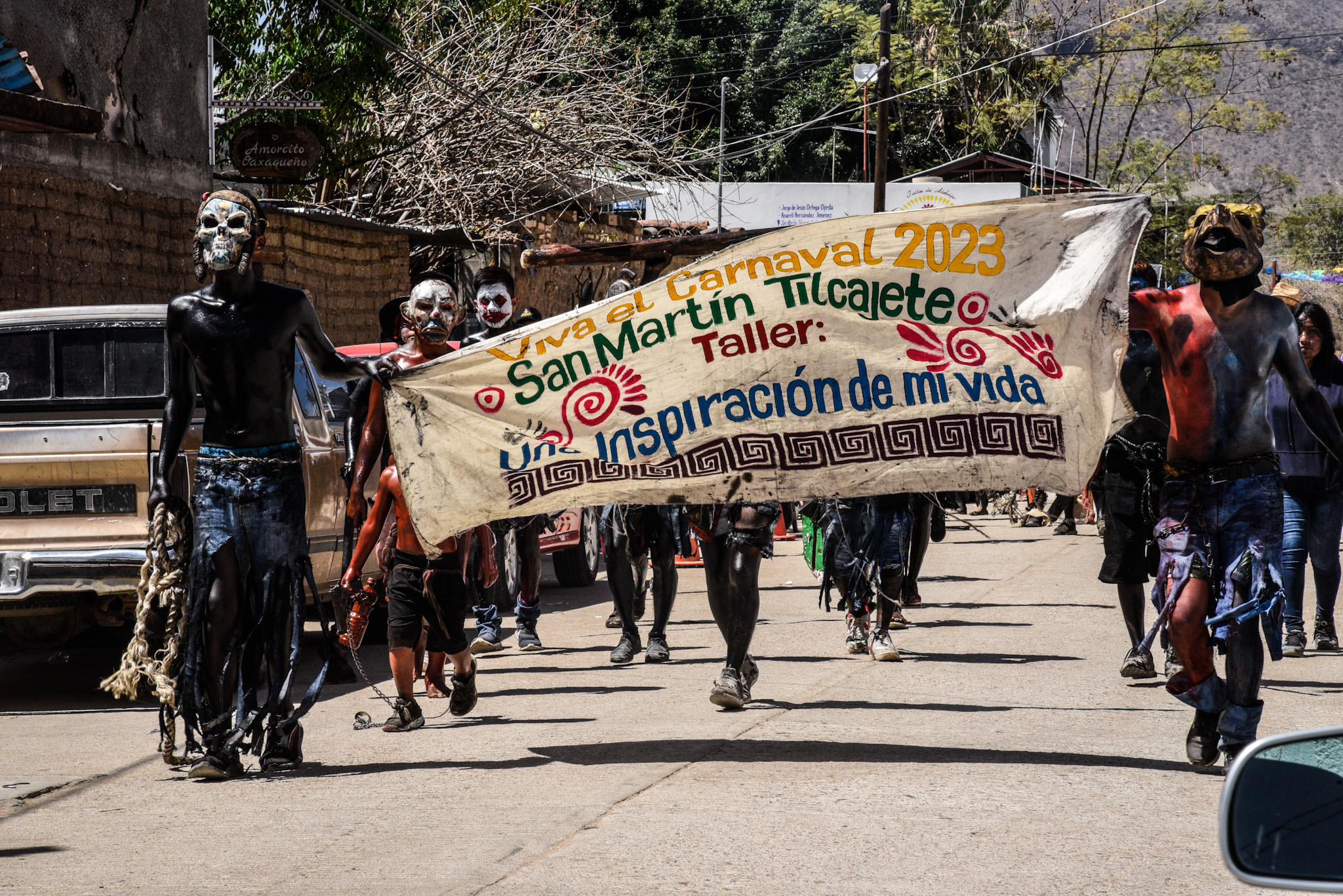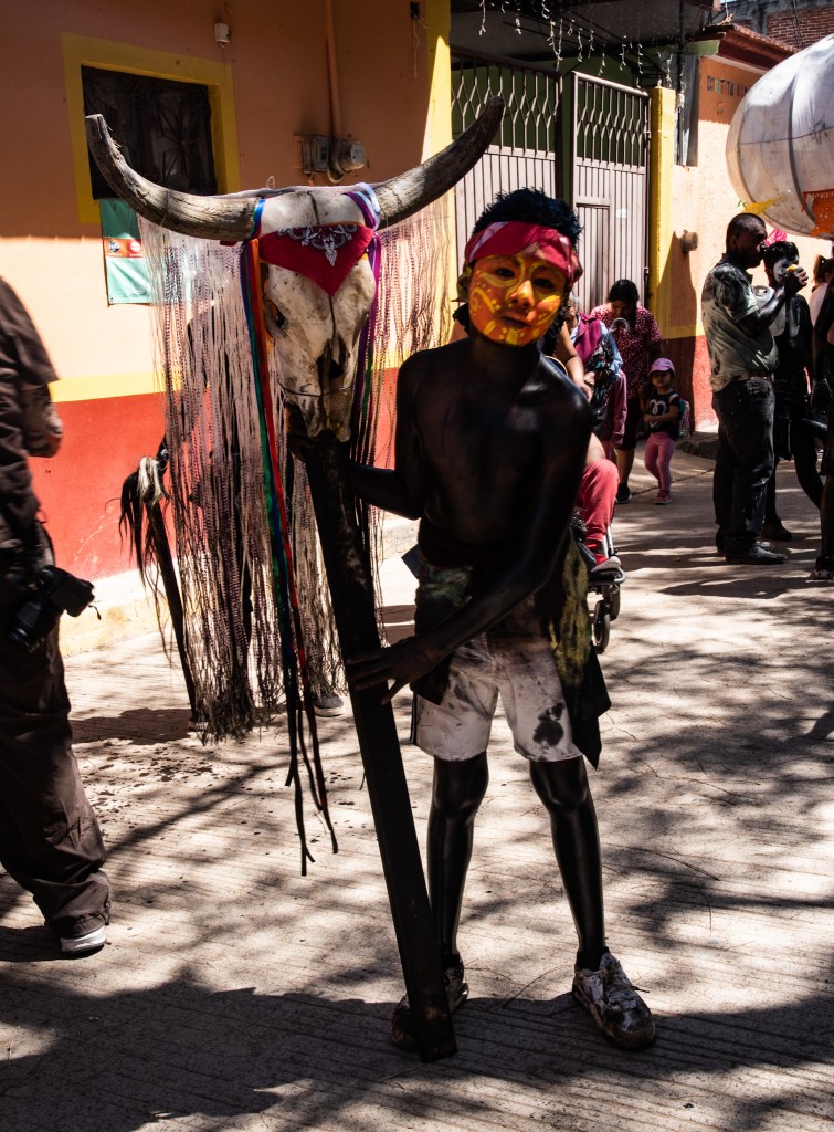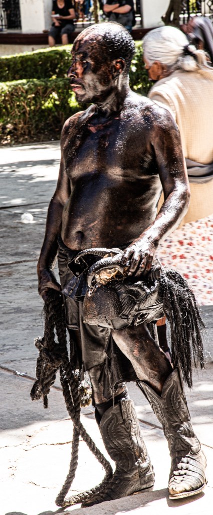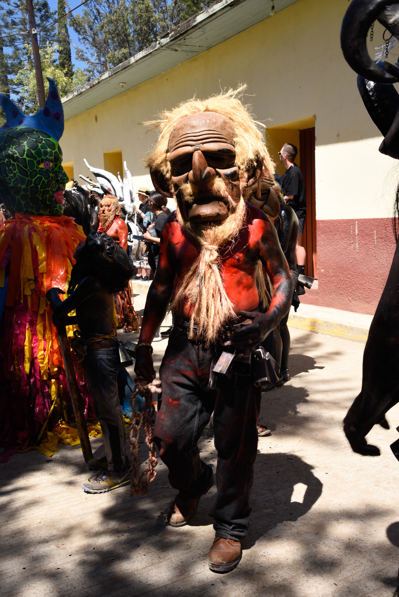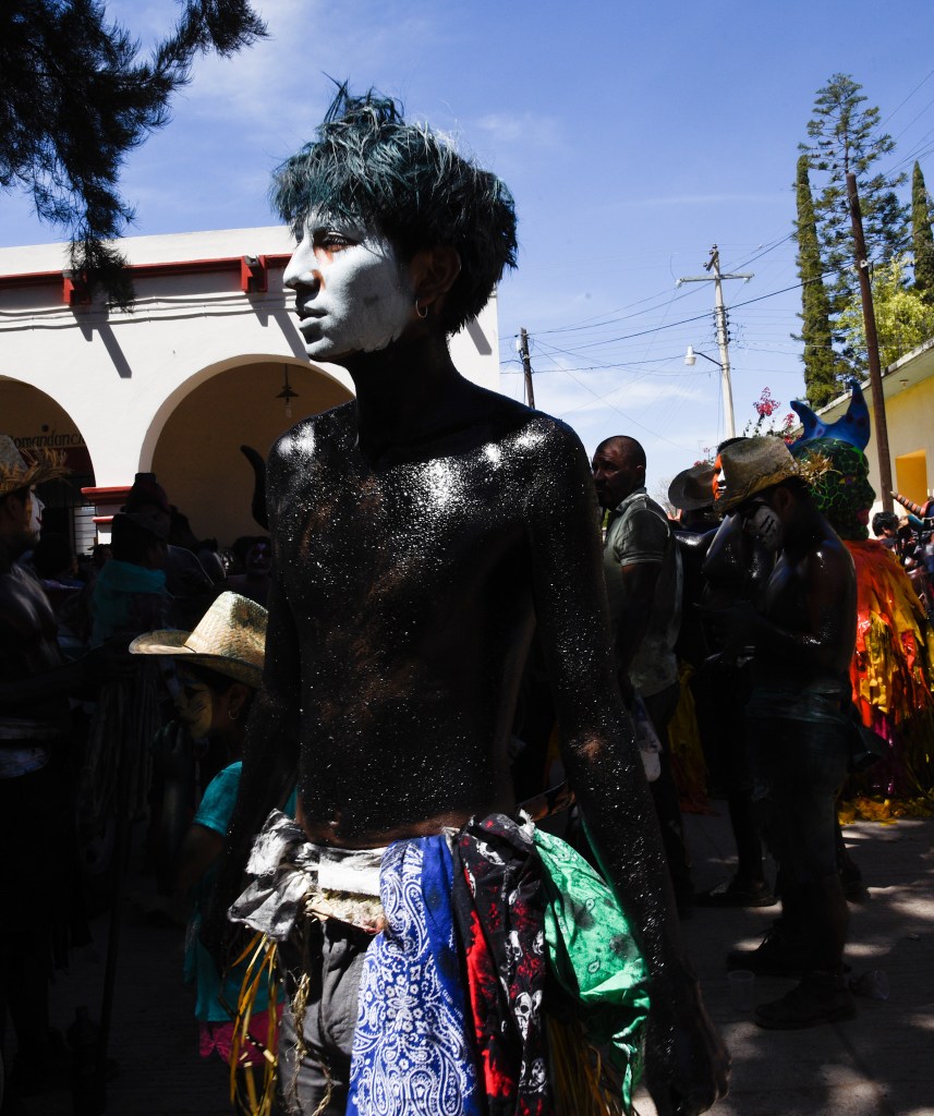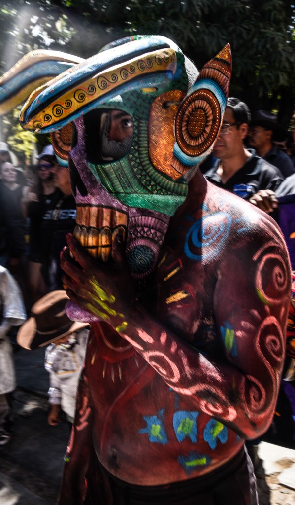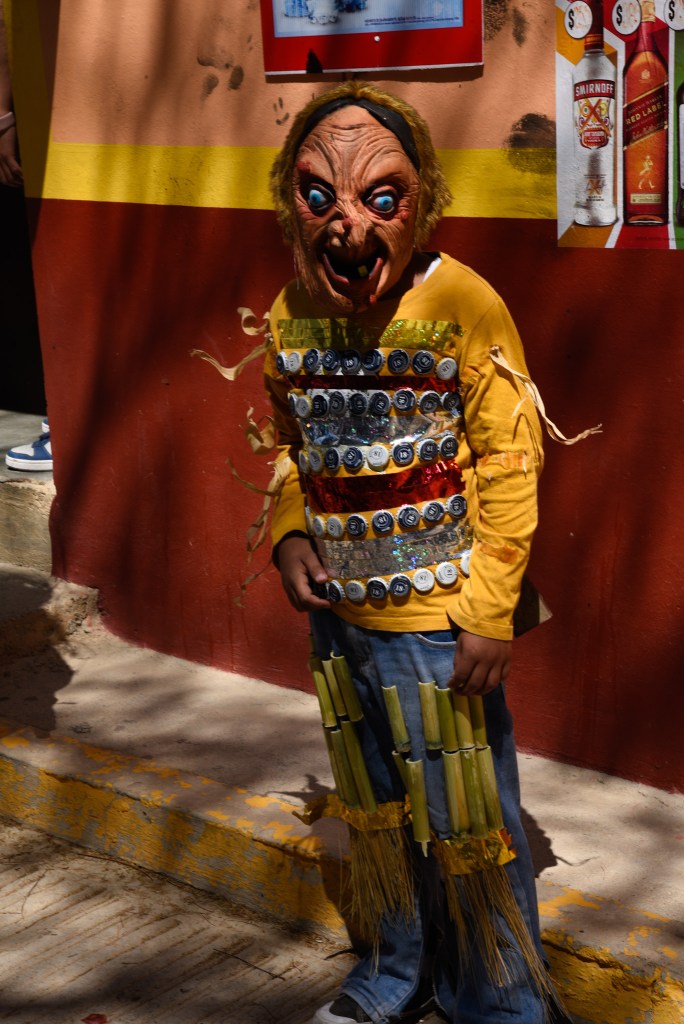 Our idea was to visit some of the workshops where these fanciful figures are made. This day, however offered a very different experience. It was Fat Tuesday for Carnaval, and San Martin Tilcajete was the place to be. Many of the workshops were closed and as we entered the town, people were lined up along the street. We could hear the chinck chinck chink of chains in the distance. And suddenly here they were, elaborate masks and bodies covered in black diesel oil.