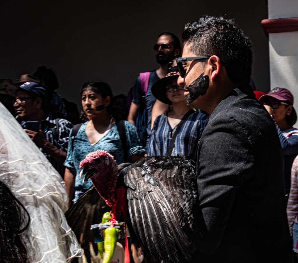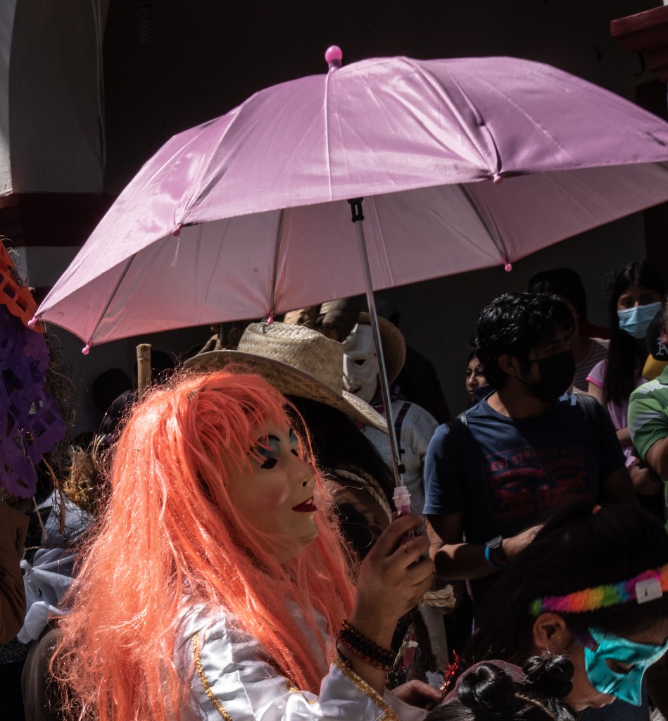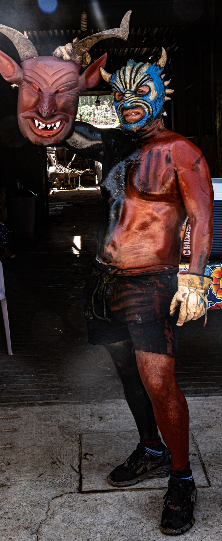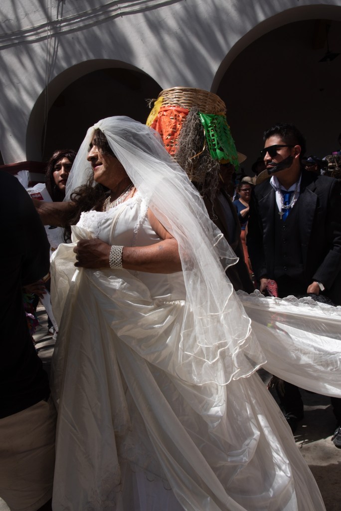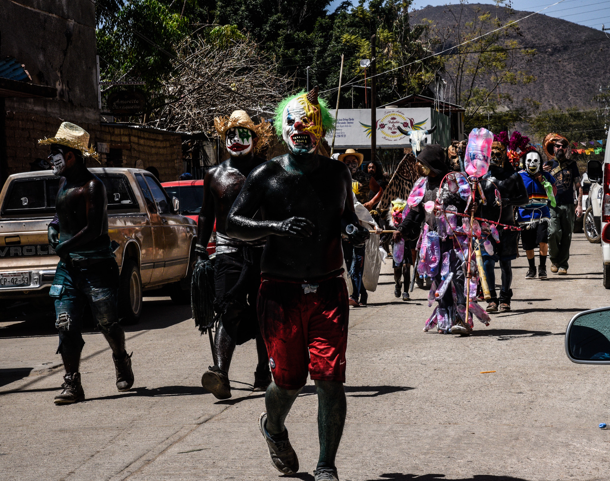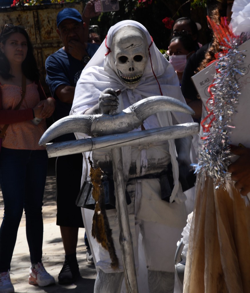 Our idea was to visit some of the workshops where these fanciful figures are made. This day, however offered a very different experience. It was Fat Tuesday for Carnaval, and San Martin Tilcajete was the place to be. Many of the workshops were closed and as we entered the town, people were lined up along the street. We could hear the chinck chinck chink of chains in the distance. And suddenly here they were, elaborate masks and bodies covered in black diesel oil.