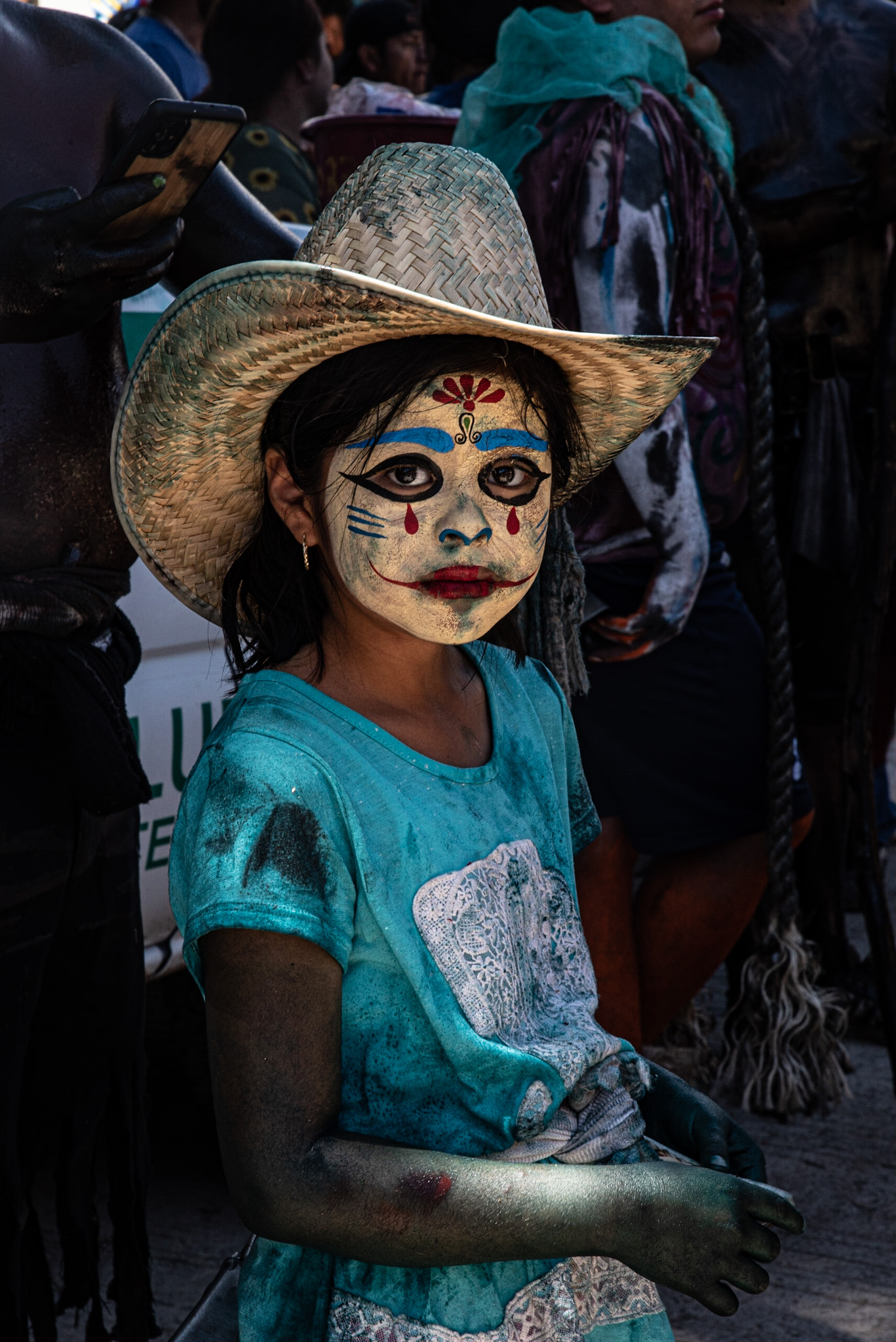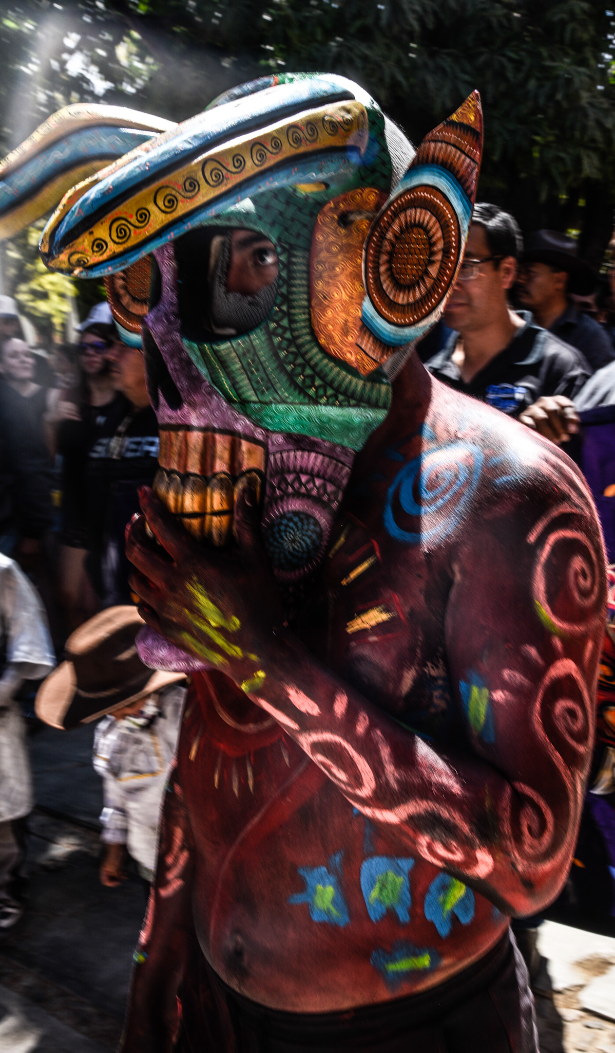 This mask and body paint reflect imagery and techniques found on the alebrijes.